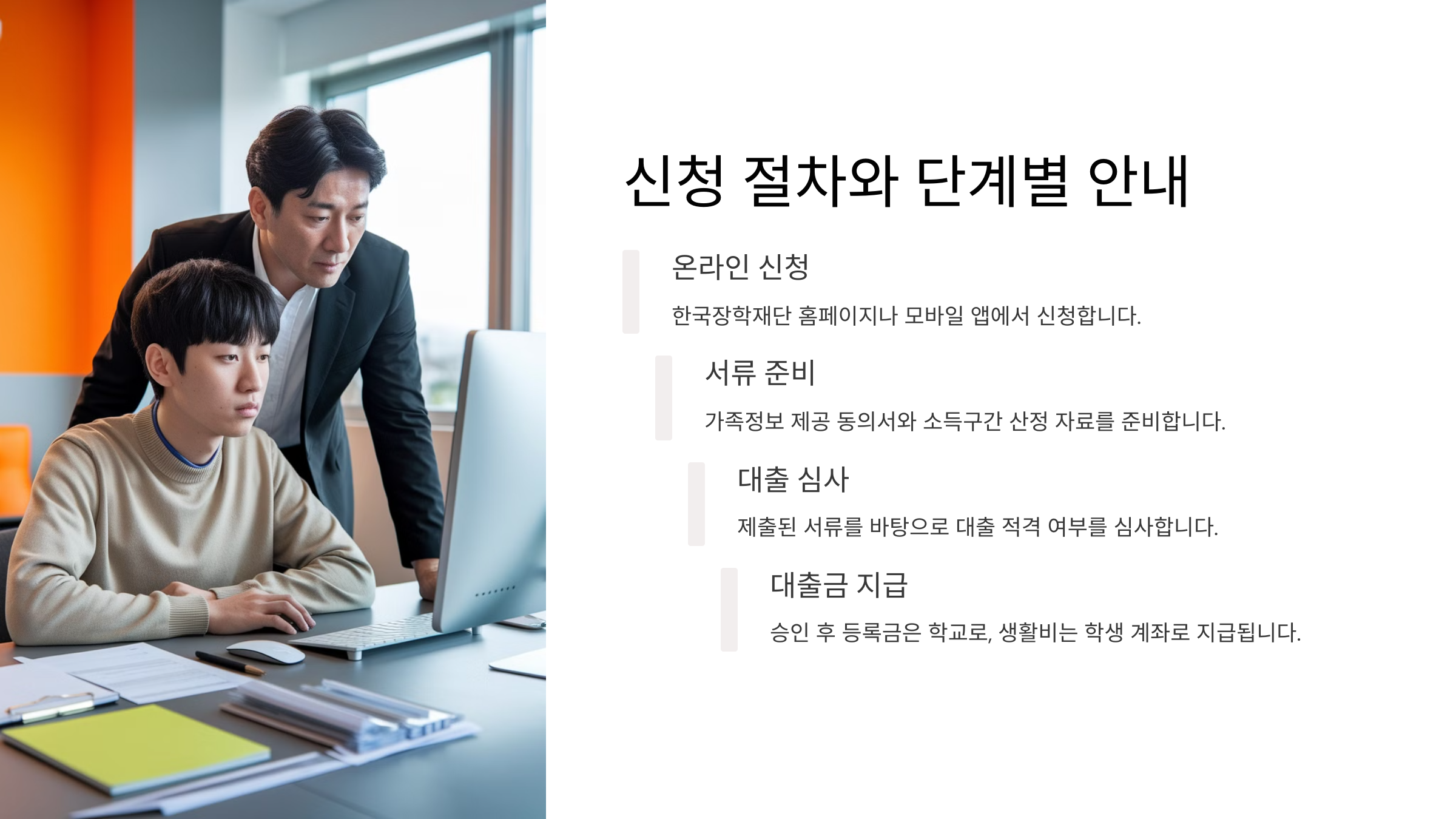 학자금 대출을 신청할 때 가장 중요한 건 ‘절차를 정확히 따르는 것’이에요. 단순히 신청 버튼만 누른다고 끝나는 게 아니라, 여러 단계의 심사를 거쳐야 하기 때문에 꼼꼼하게 준비해야 해요.