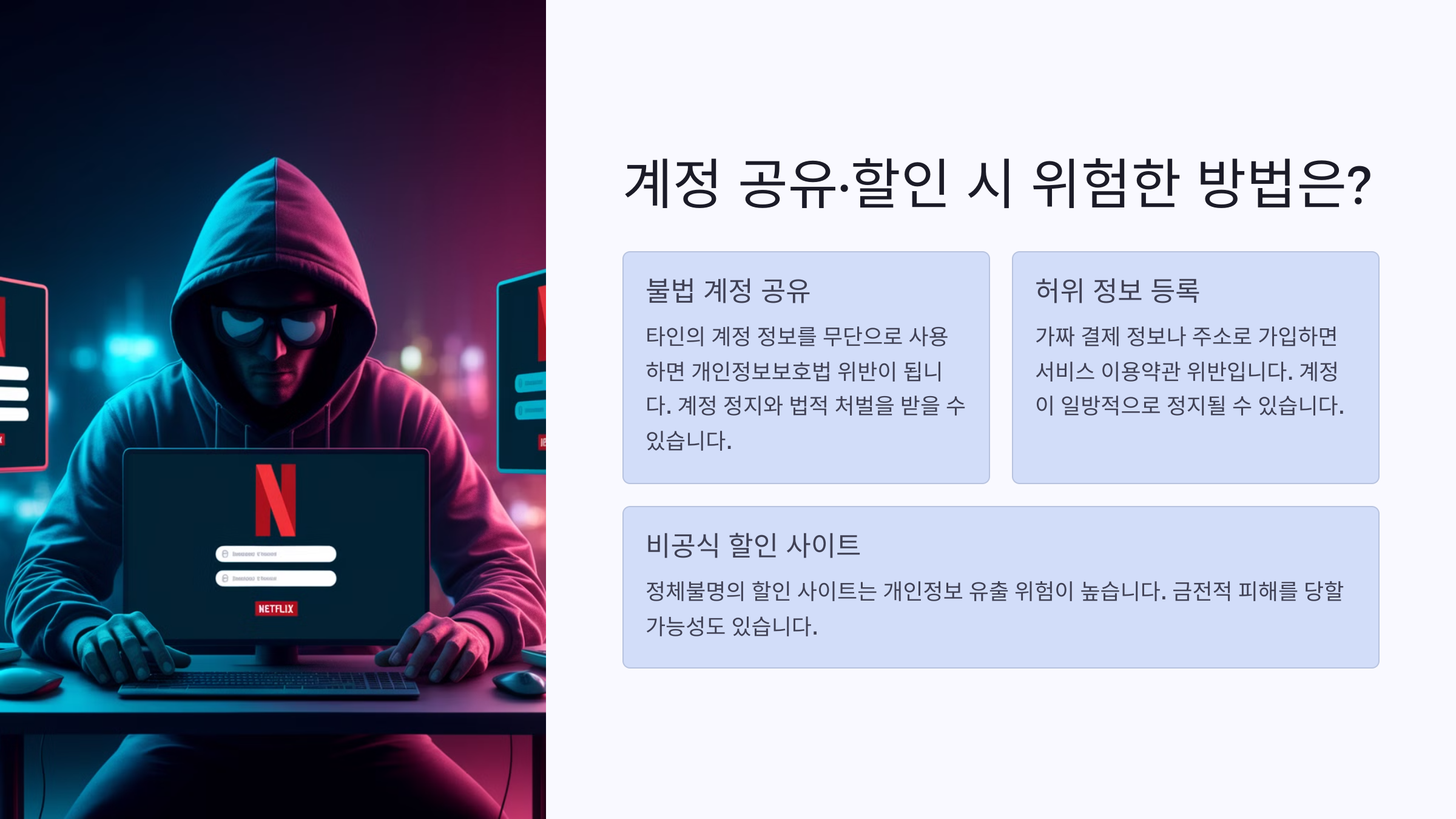 넷플릭스를 더 저렴하게 이용하려다 보면 불법적인 방법을 시도하는 경우도 있어요. 하지만 이런 방법은 계정 정지, 개인 정보 유출, 법적 문제로 이어질 수 있기 때문에 절대 추천하지 않아요. 🚨