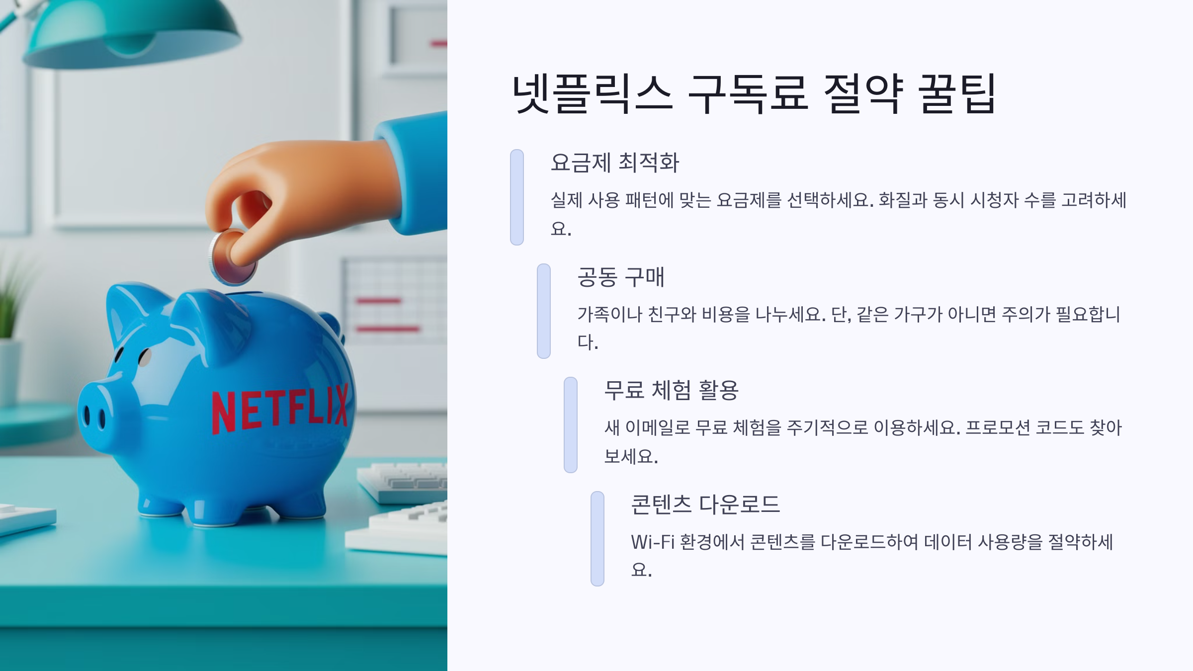 위 방법을 조합해서 사용하면 넷플릭스를 훨씬 저렴하게 이용할 수 있어요! 특히, 가족과 요금을 나눠 내거나, 프로모션을 노리는 방법은 누구나 쉽게 시도할 수 있답니다. 🎉