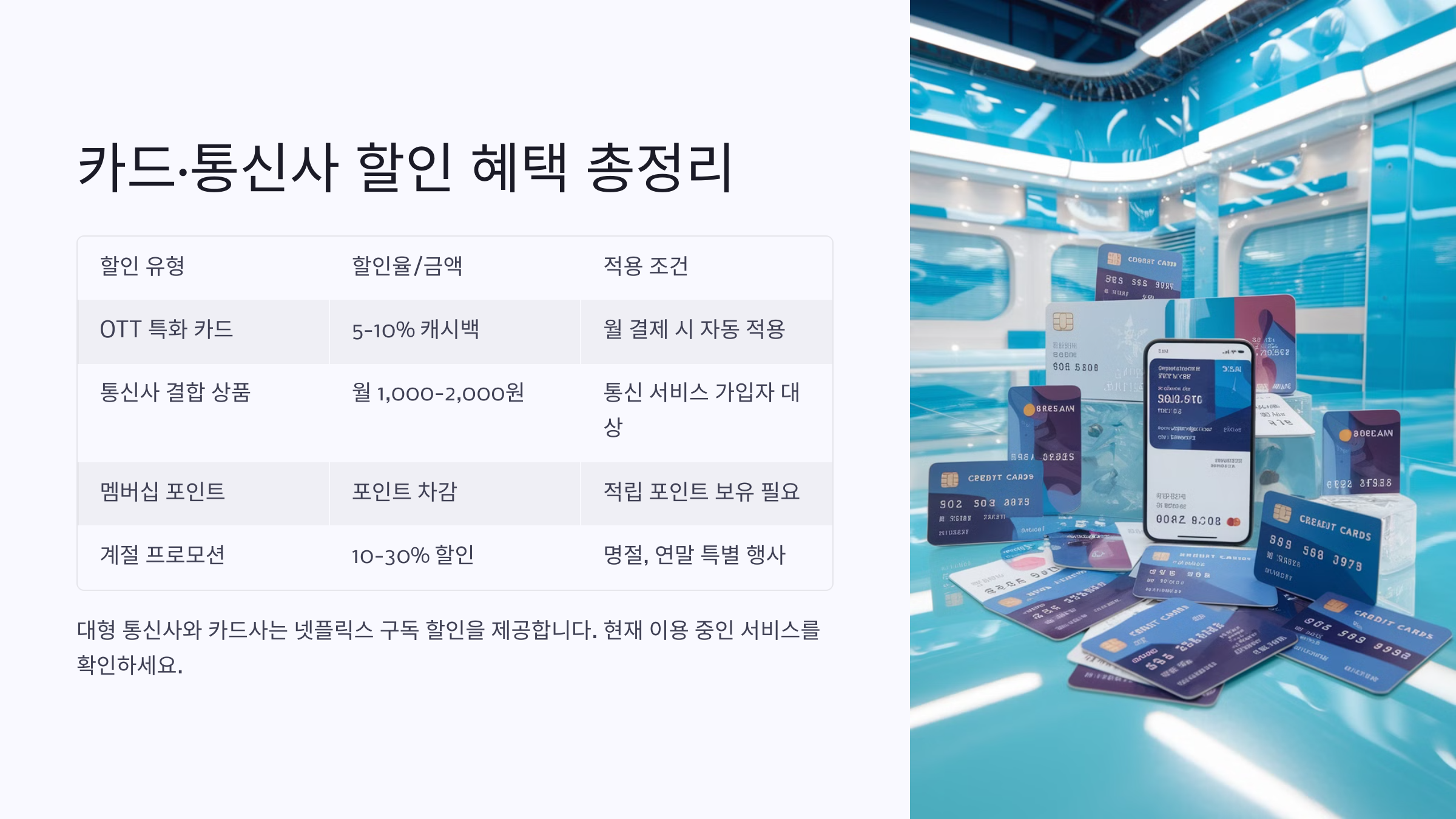 넷플릭스 요금을 아끼는 또 다른 방법은 카드 할인과 통신사 결합 혜택을 활용하는 거예요! 일부 신용카드는 넷플릭스 요금 할인을 제공하고, 통신사 요금제와 묶으면 추가 비용 없이 넷플릭스를 이용할 수도 있어요. 🎉