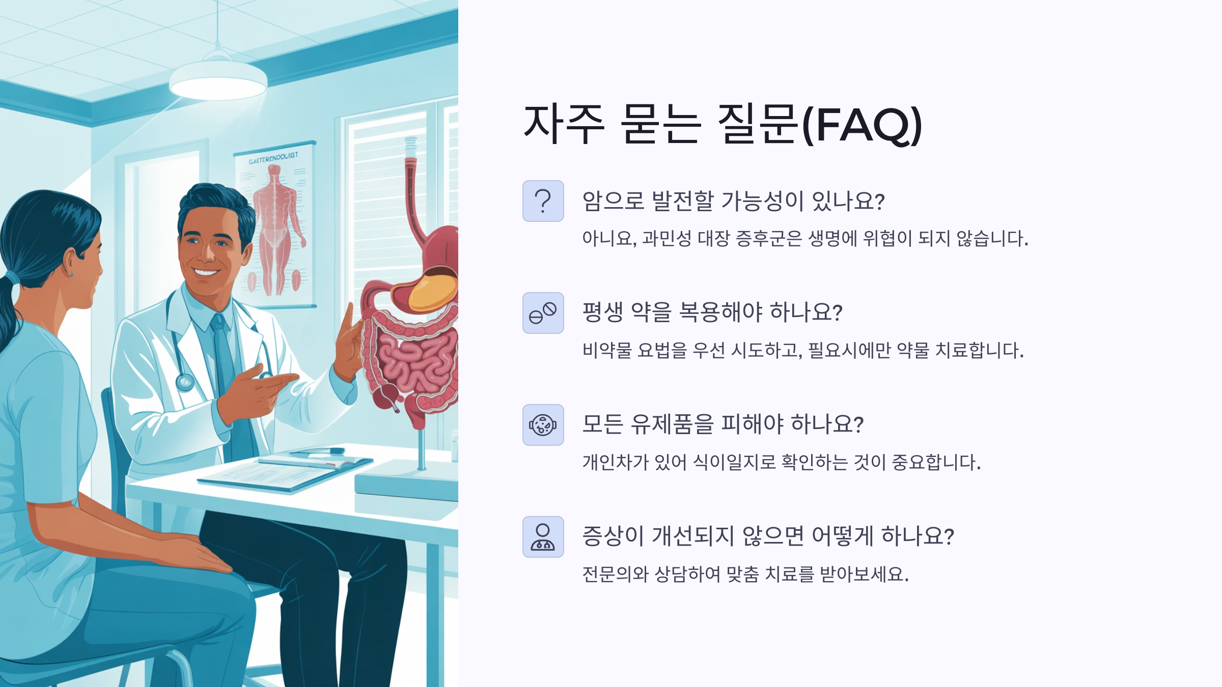 A3. 네, 스트레스는 IBS 증상을 직접적으로 악화시켜요. 명상, 산책, 운동 등 스트레스 관리만 잘해도 훨씬 나아질 수 있어요.