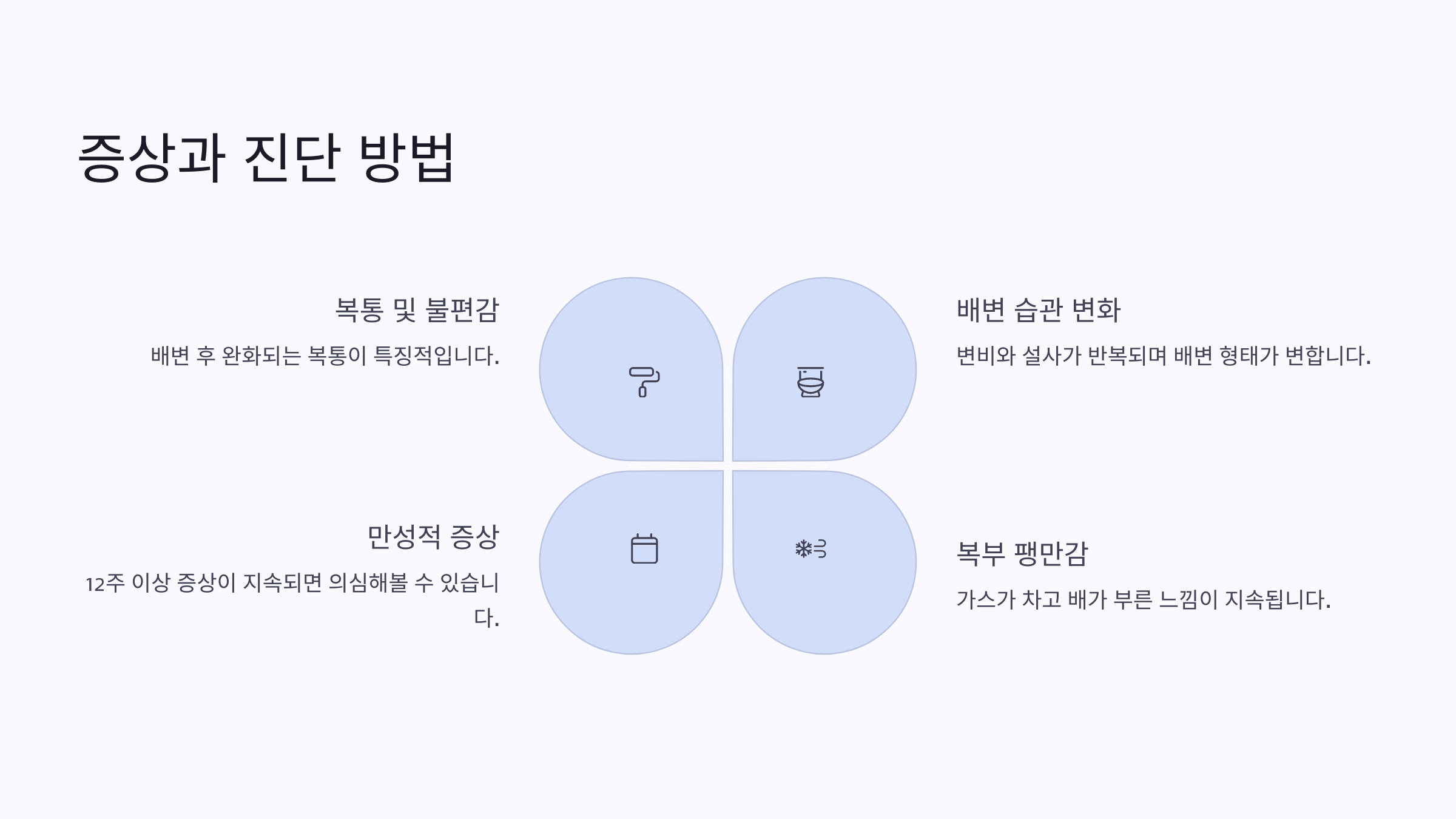 복통, 복부 팽만, 잦은 설사나 변비, 혹은 두 가지가 번갈아 나타나는 것이 특징이에요. 심한 경우에는 대중교통을 타거나 회의 중에도 화장실을 걱정해야 할 정도로 일상생활에 큰 불편을 초래해요.