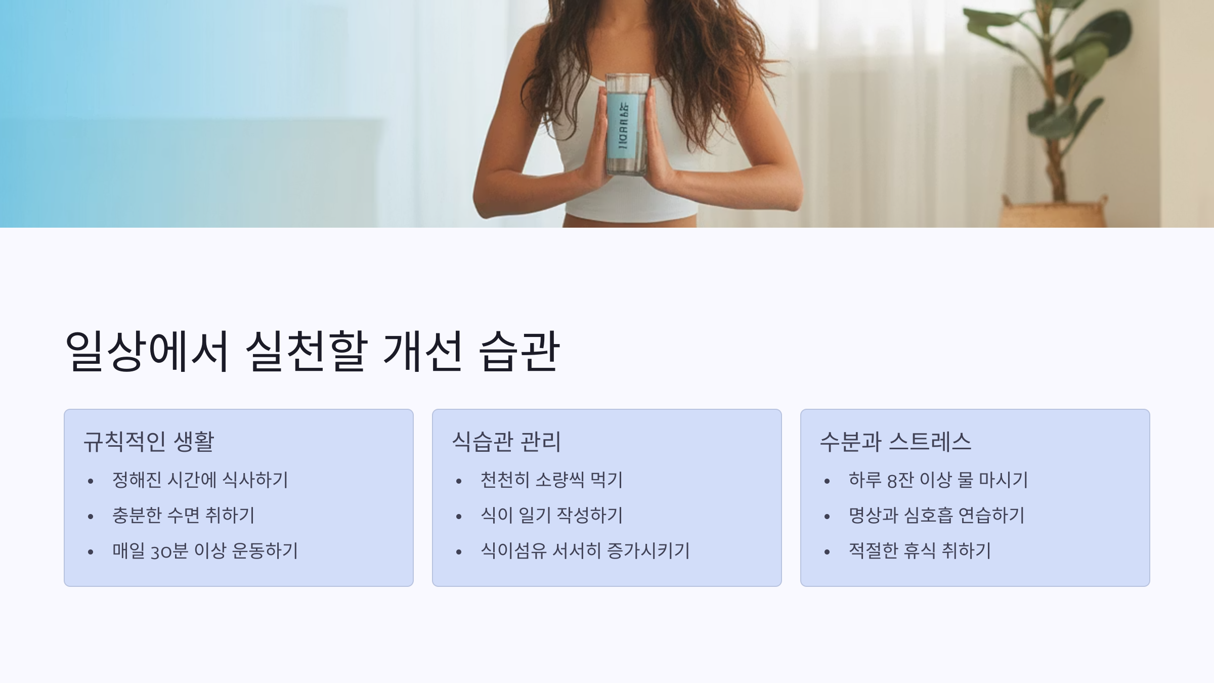 | 수분 섭취 | 하루 1.5~2L 물 마시기 | 투명 물병 사용 |