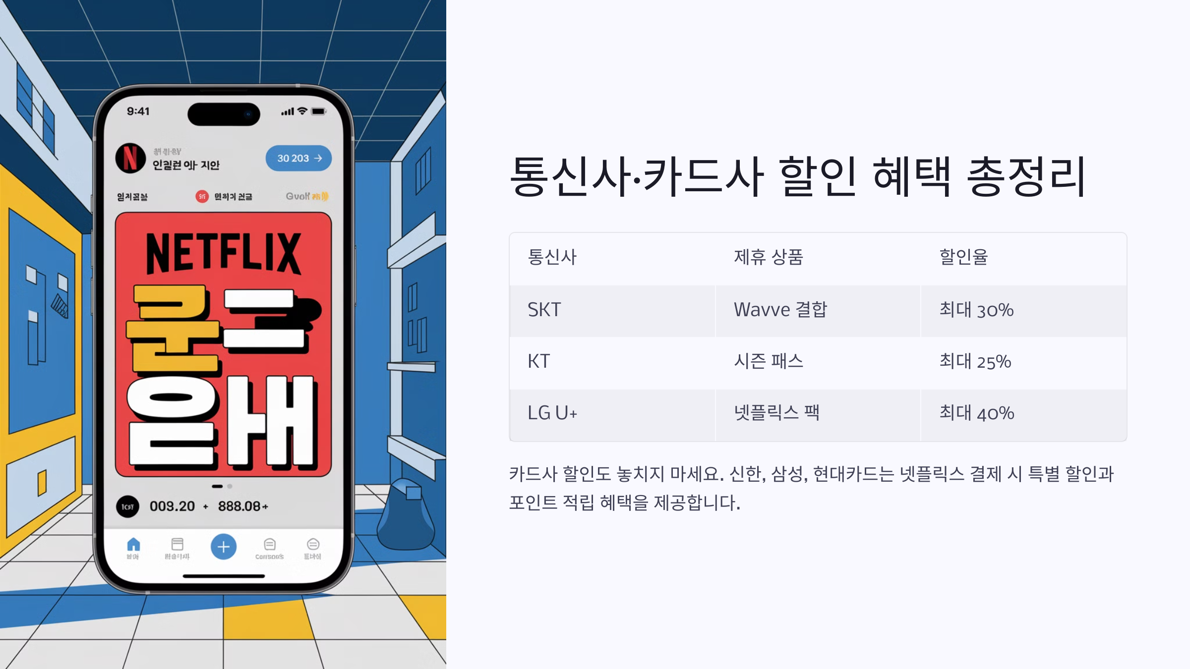 넷플릭스는 일부 통신사 및 카드사와 제휴하여 추가 할인 혜택을 제공하기도 해요. 📱💳