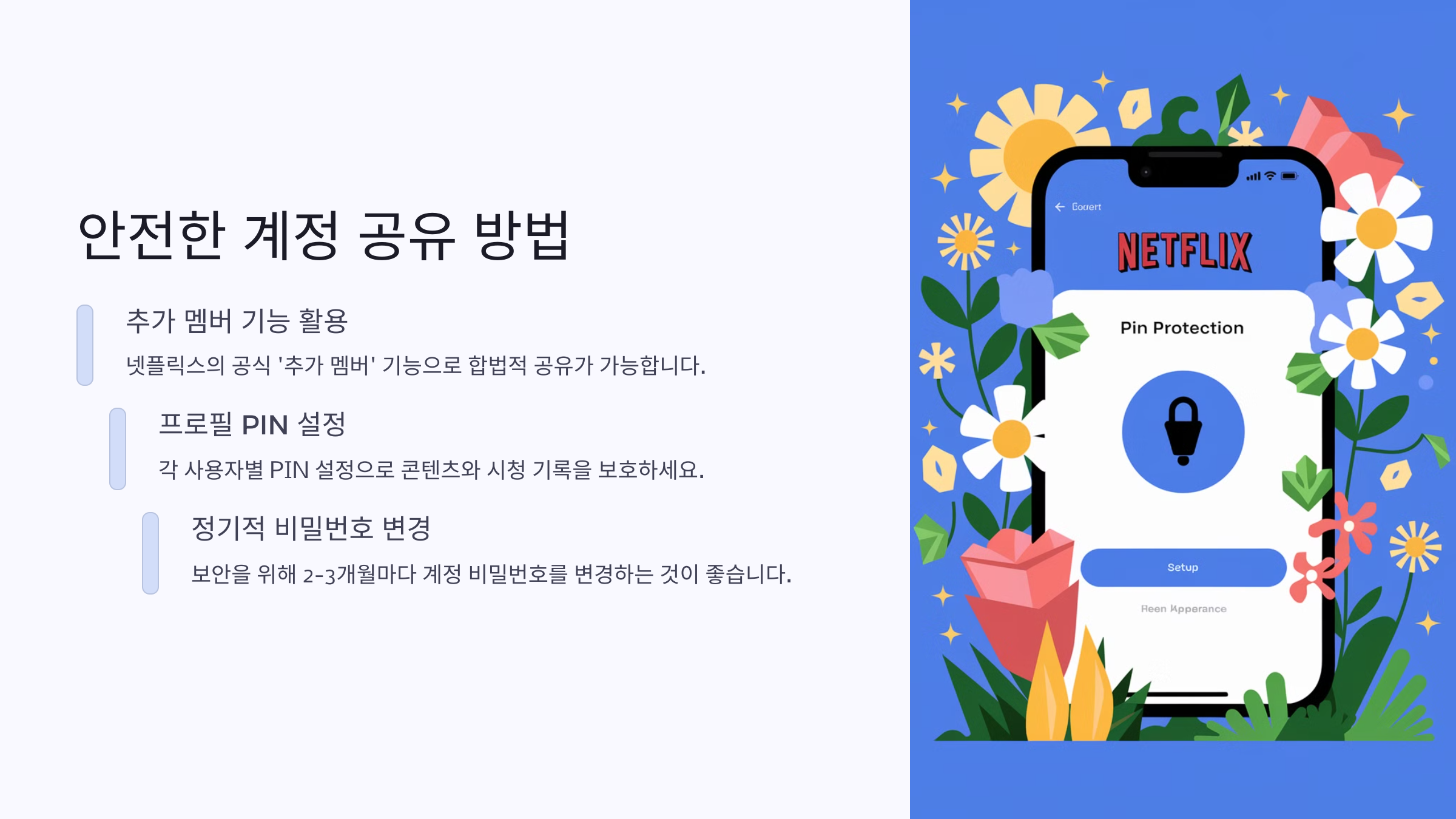 ❗ **넷플릭스는 어떤 조치를 취할까?** 넷플릭스는 기본적으로 계정 차단, 추가 요금 부과 등의 조치를 취해요. 하지만 지속적으로 계정 공유를 시도할 경우, 서비스 이용 정지를 할 수도 있어요.