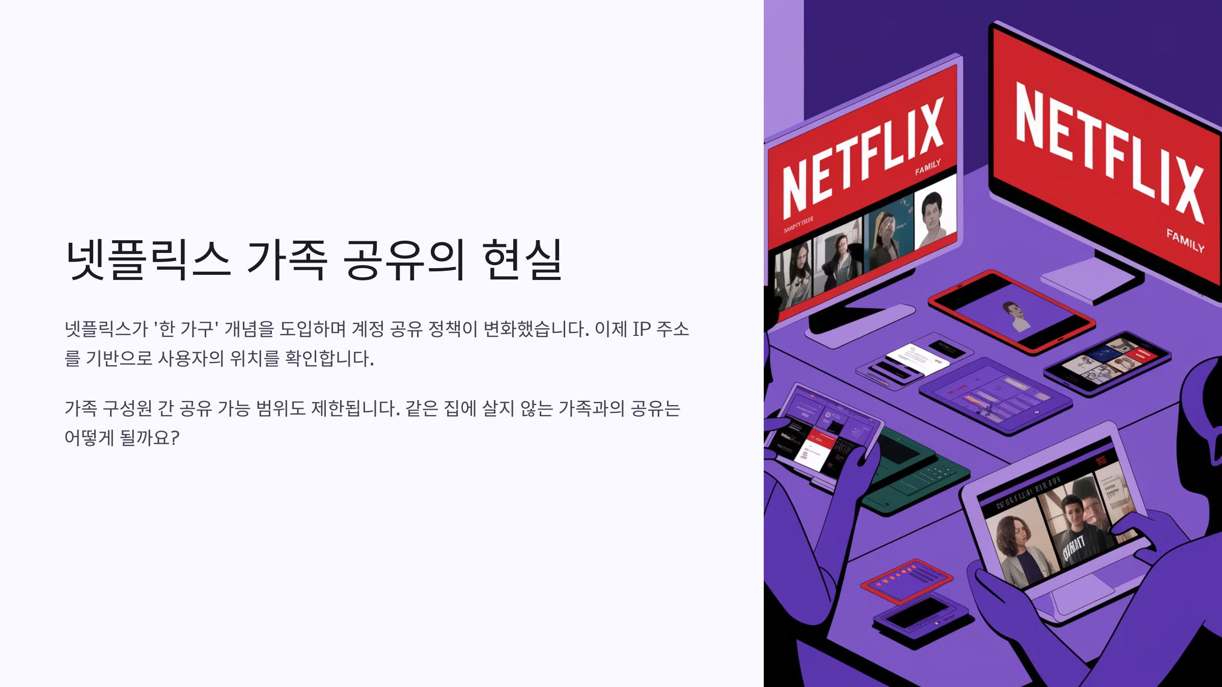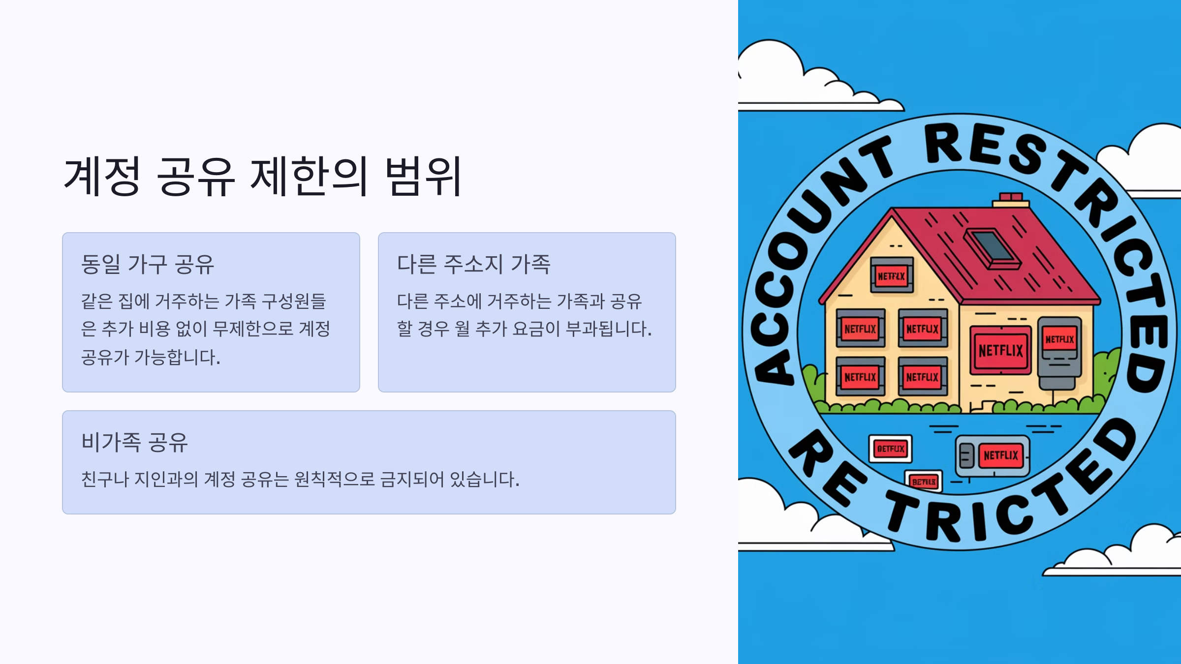 넷플릭스는 계정 공유 정책을 지속적으로 강화하면서, '가구 내 공유' 원칙을 엄격하게 적용하고 있어요. 예전에는 친구나 다른 지역에 사는 가족과 쉽게 공유할 수 있었지만, 이제는 IP 주소와 기기 정보를 활용해 계정 사용 지역을 확인하고 있죠.