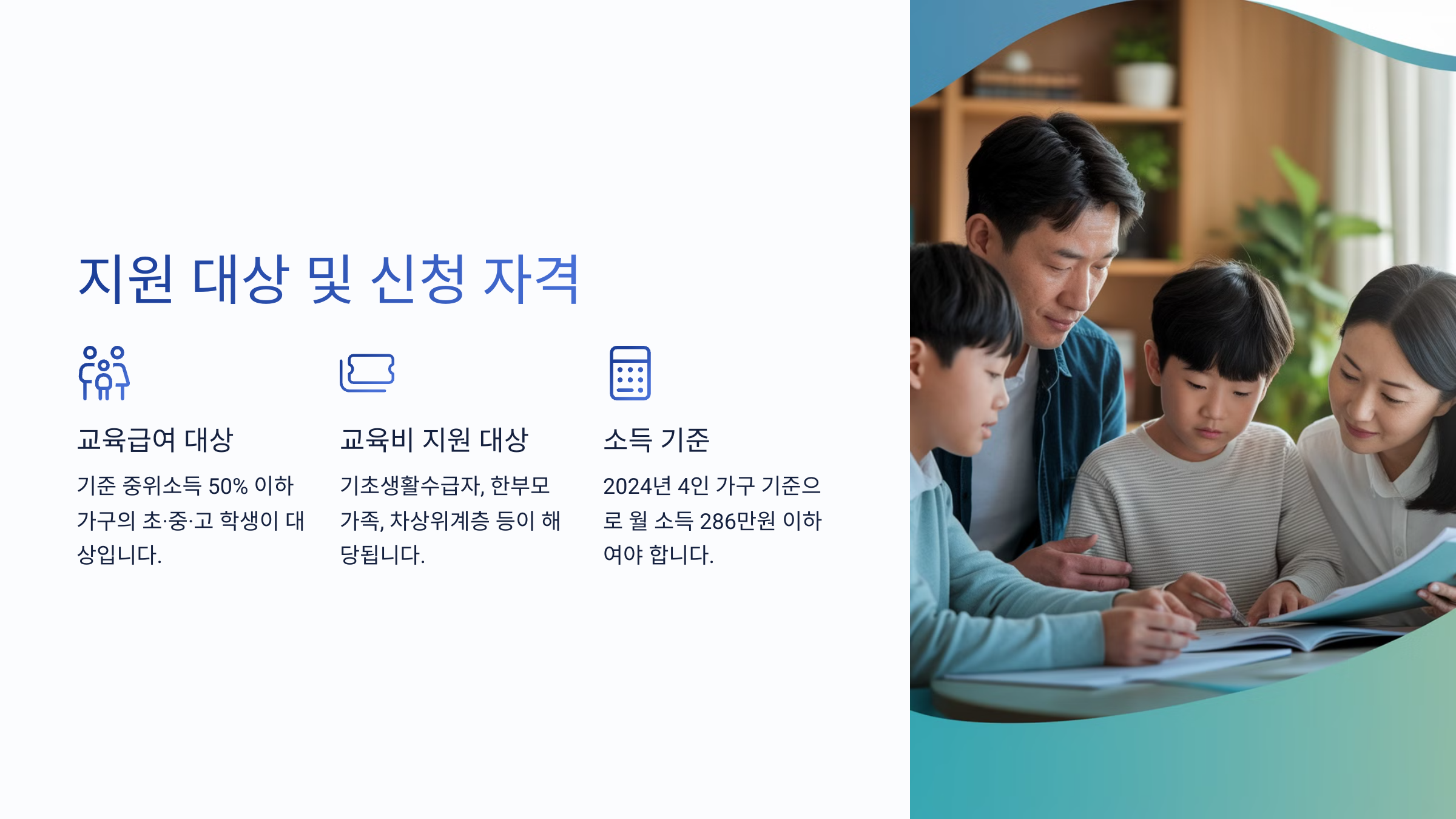 위 소득 기준을 충족하면 교육급여 및 교육비 지원을 신청할 수 있어요. 정확한 소득인정액 산정은 신청 후 복지 부서에서 심사해요! 📑