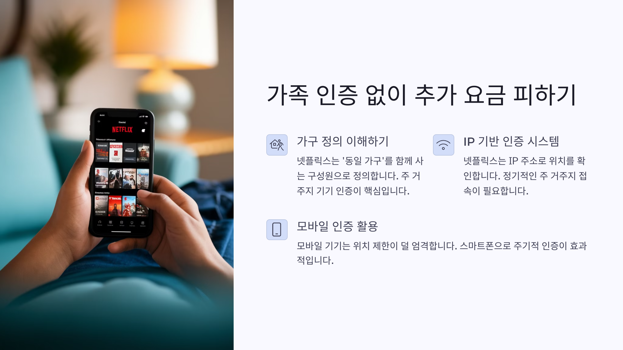 즉, 공유 계정을 사용하는 사람이 한 달에 한두 번이라도 기본 위치(Wi-Fi)에서 접속하면 넷플릭스가 동일 가구로 인식할 가능성이 커요. 이를 활용하면 가족 인증 없이도 추가 요금을 피할 수 있어요!