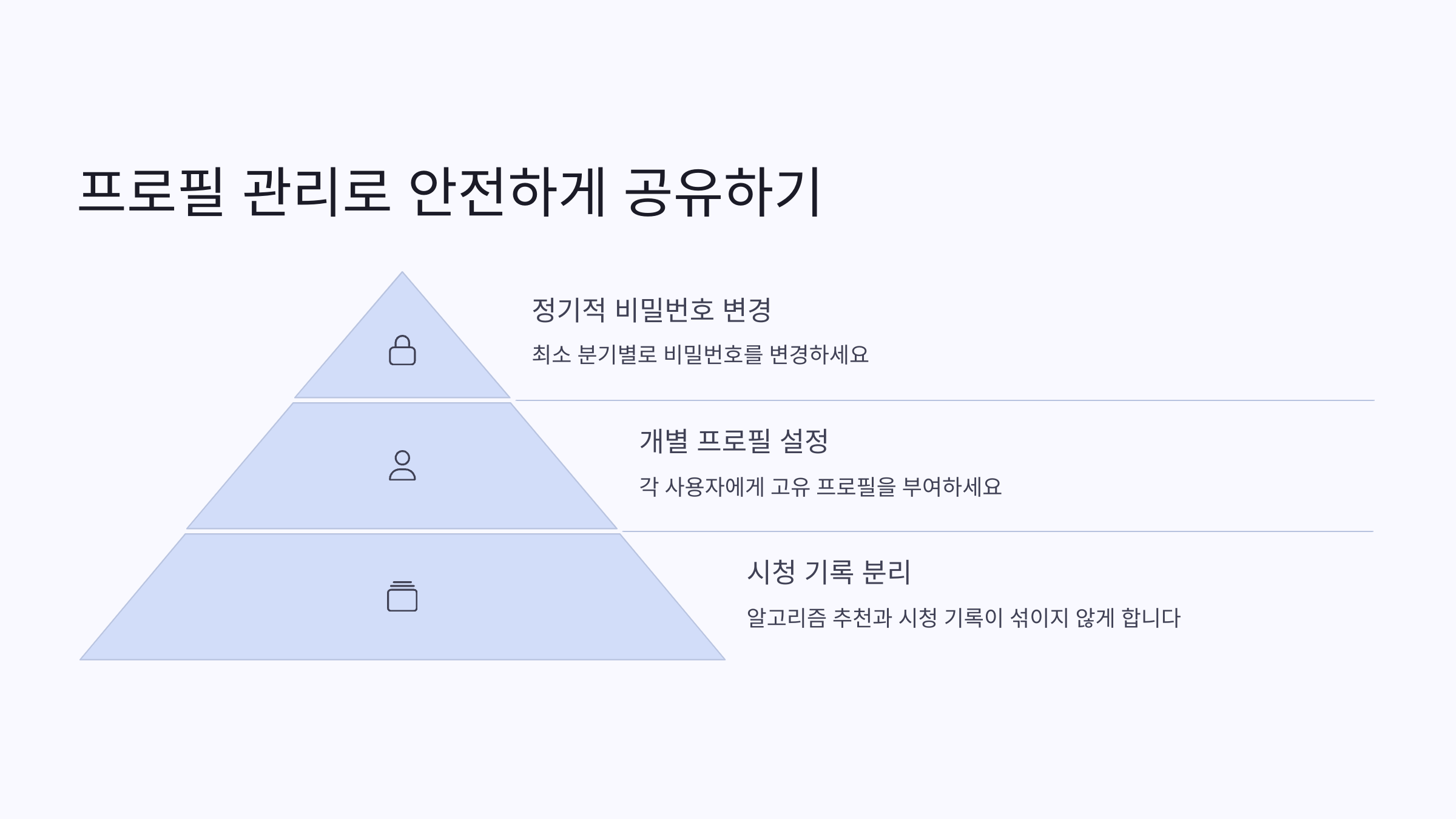 또한, 프로필 비밀번호를 설정하면 공유된 계정이라도 각자의 시청 기록과 추천 콘텐츠를 유지할 수 있어서 더욱 편리해요. 만약 여러 명이 하나의 프로필을 공유할 경우, 서로 다른 취향이 반영된 추천 목록이 뒤섞일 수 있으니 개별 프로필을 사용하는 게 좋아요.