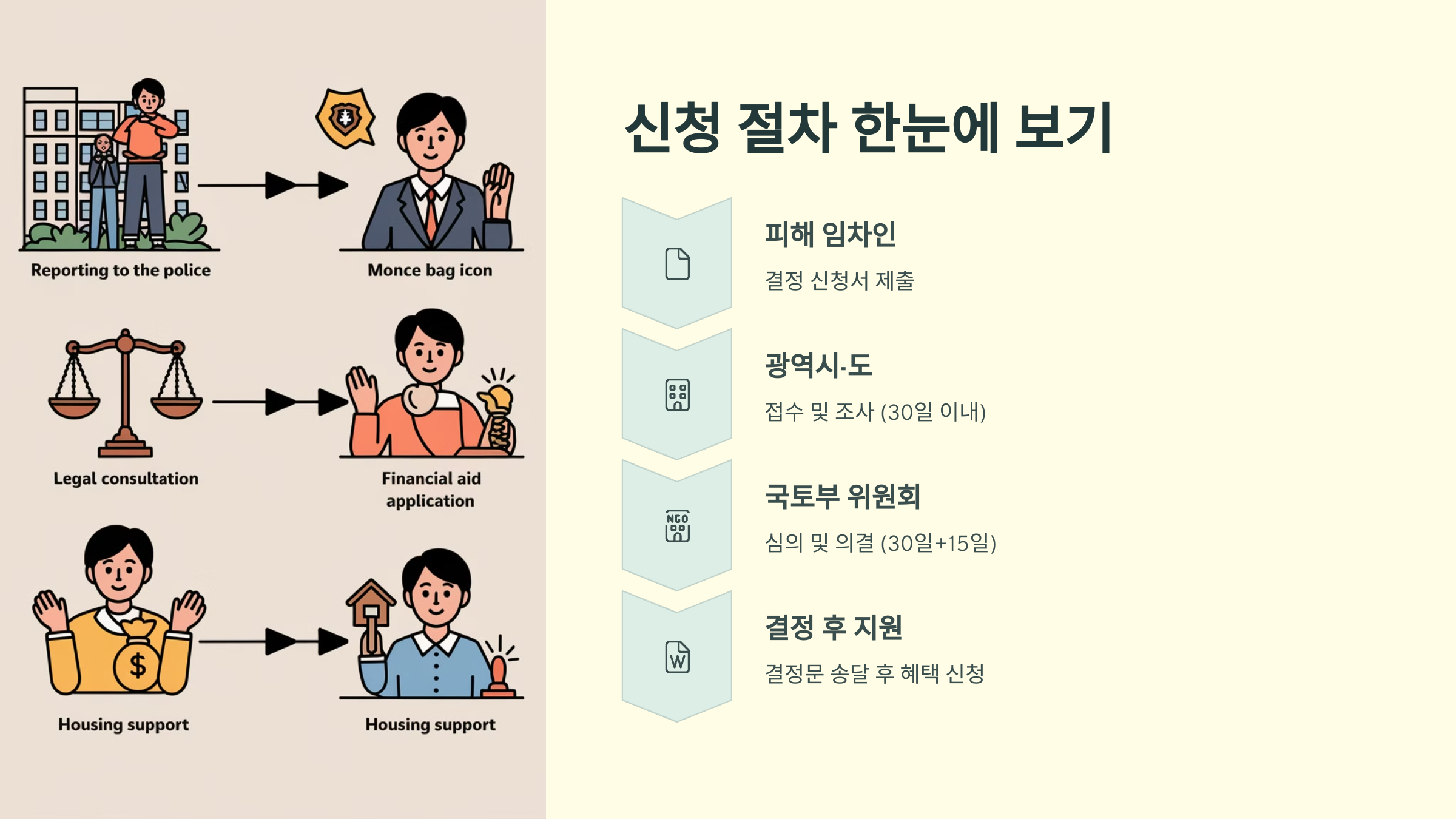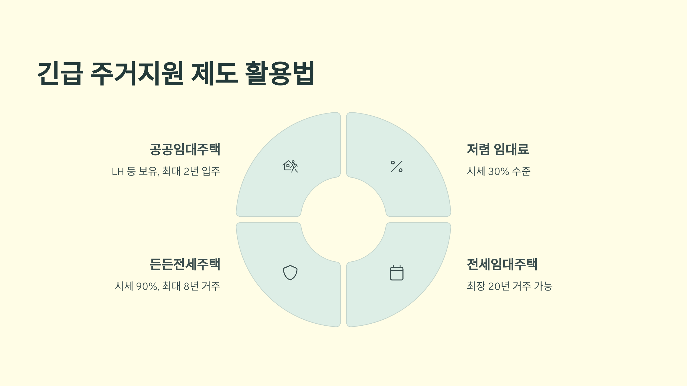 | 긴급 주택 지원 | 단기적으로 숙소 제공 | 즉시 거주지가 필요한 피해자 |