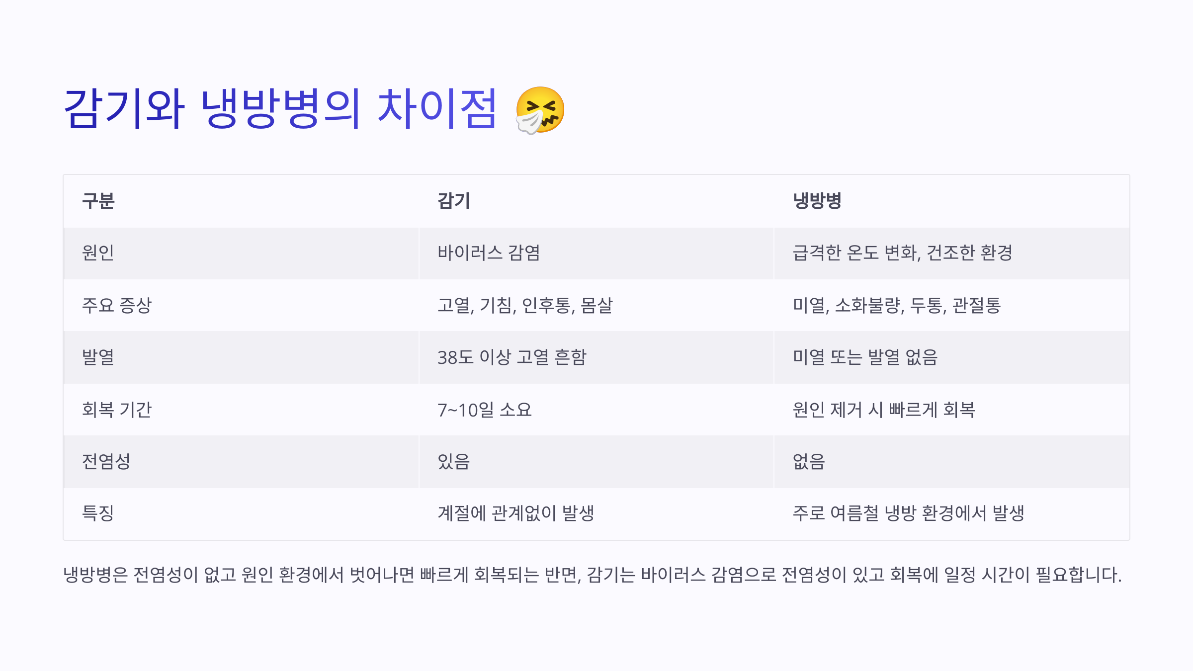 | 원인 | 바이러스 감염 | 온도 변화, 자율신경 불균형 |
