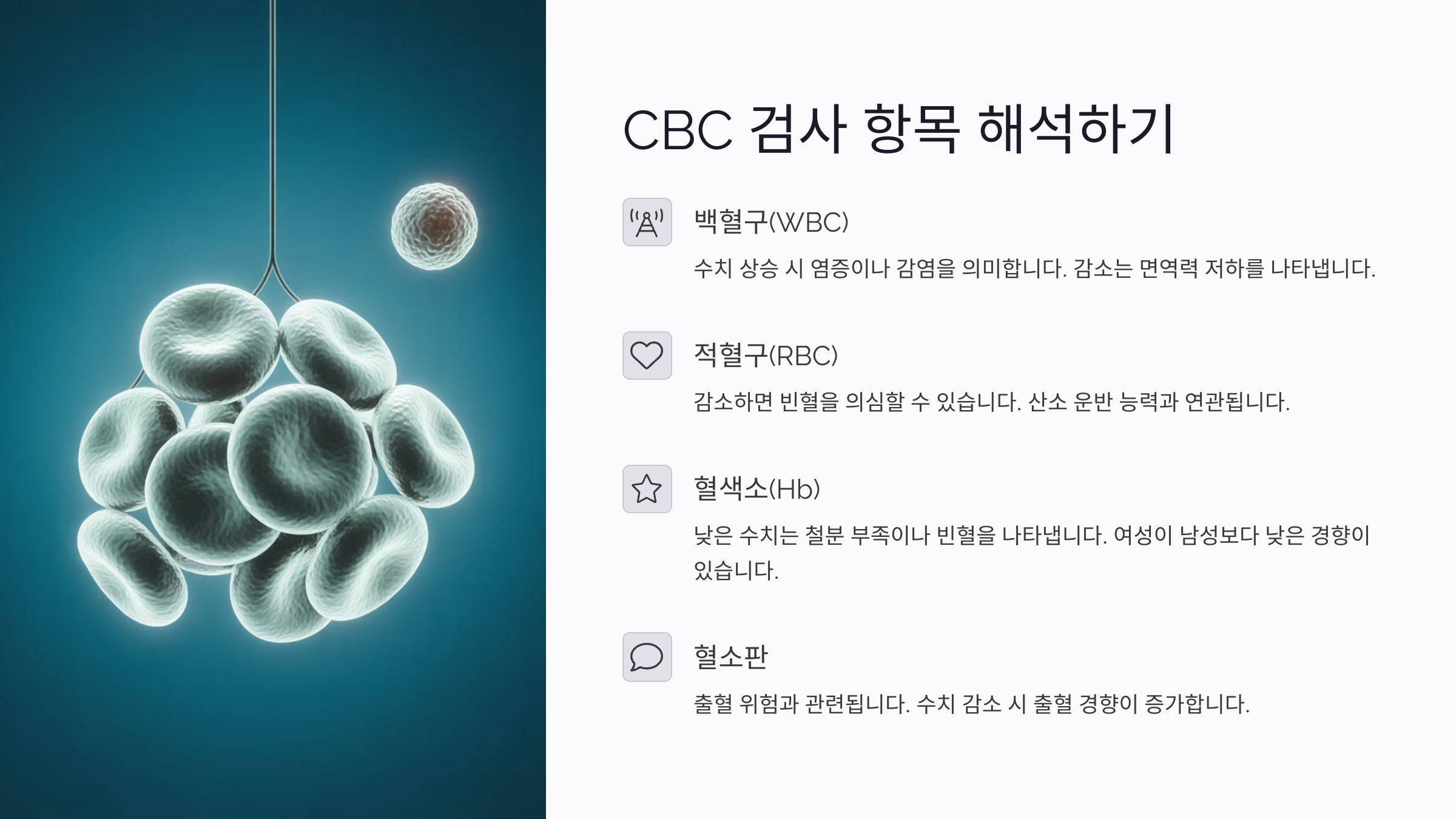그럼 이제 본격적으로 혈액검사의 대표 항목인 CBC부터 차근차근 설명해볼게요. 각 수치의 의미와 건강과의 연관성을 자세히 알려드릴게요! 🔍