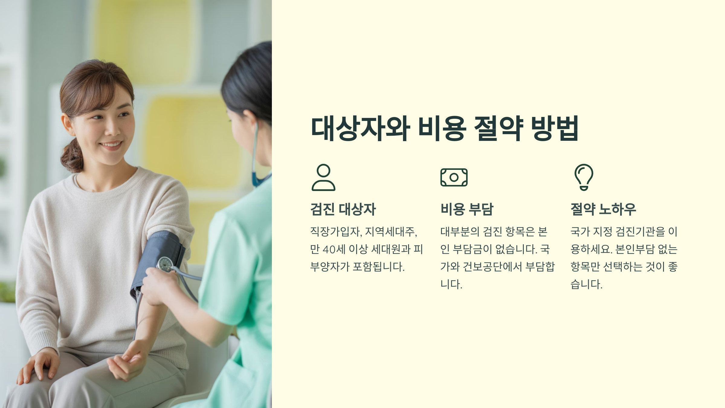 검진 대상자는 건강보험공단 홈페이지 또는 우편으로 안내를 받을 수 있고, 지정 병원에서 예약 후 검진을 진행할 수 있어요.