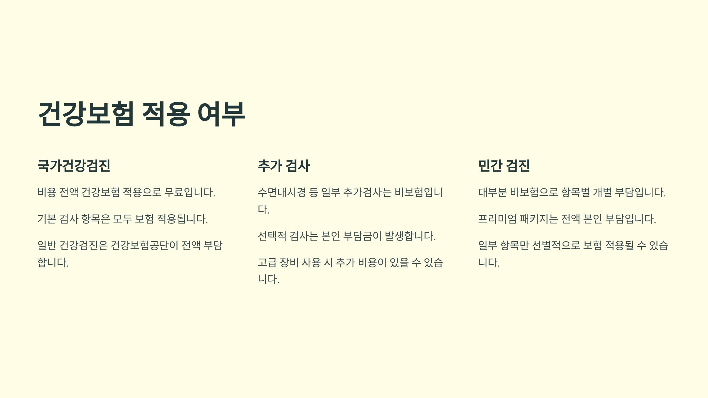 국가건강검진은 국민건강보험공단이 비용을 전액 또는 일부 지원해주기 때문에 대부분 무료로 받을 수 있어요. 하지만 민간 종합검진은 전액 본인 부담이기 때문에 보험 적용이 안 돼요.