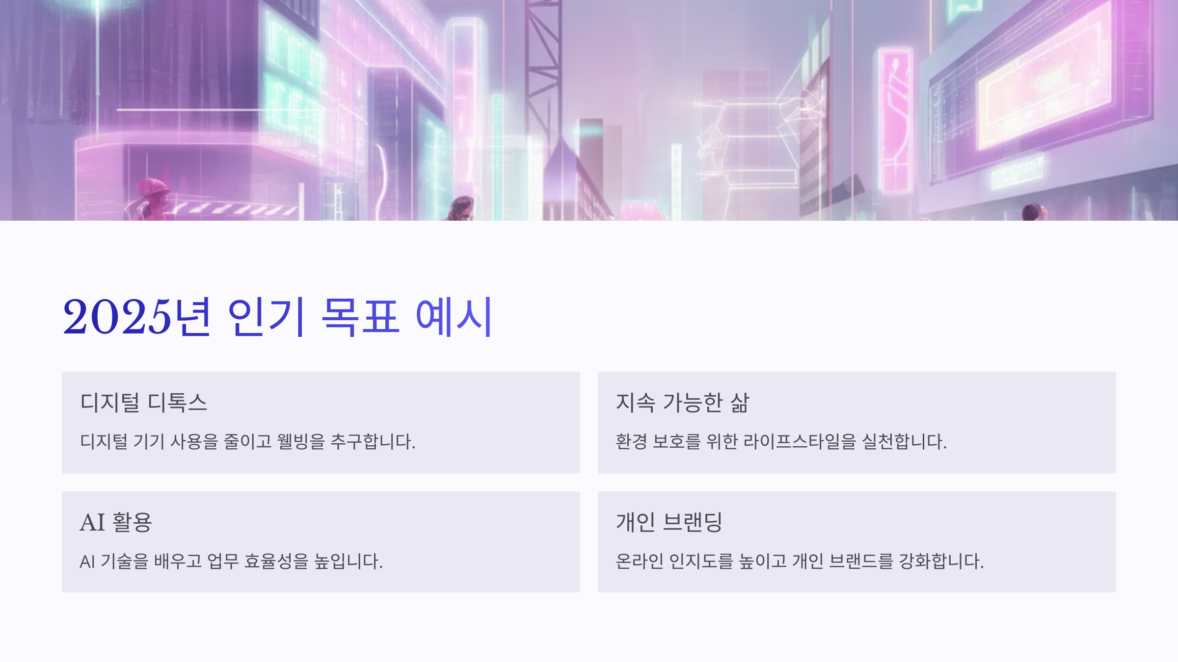 요즘은 '디지털 노마드'처럼 장소에 구애받지 않고 일하는 라이프스타일을 꿈꾸는 분들이 많아서, '원격 근무 준비하기', '온라인 강의 열기' 같은 목표도 핫한 편이에요.