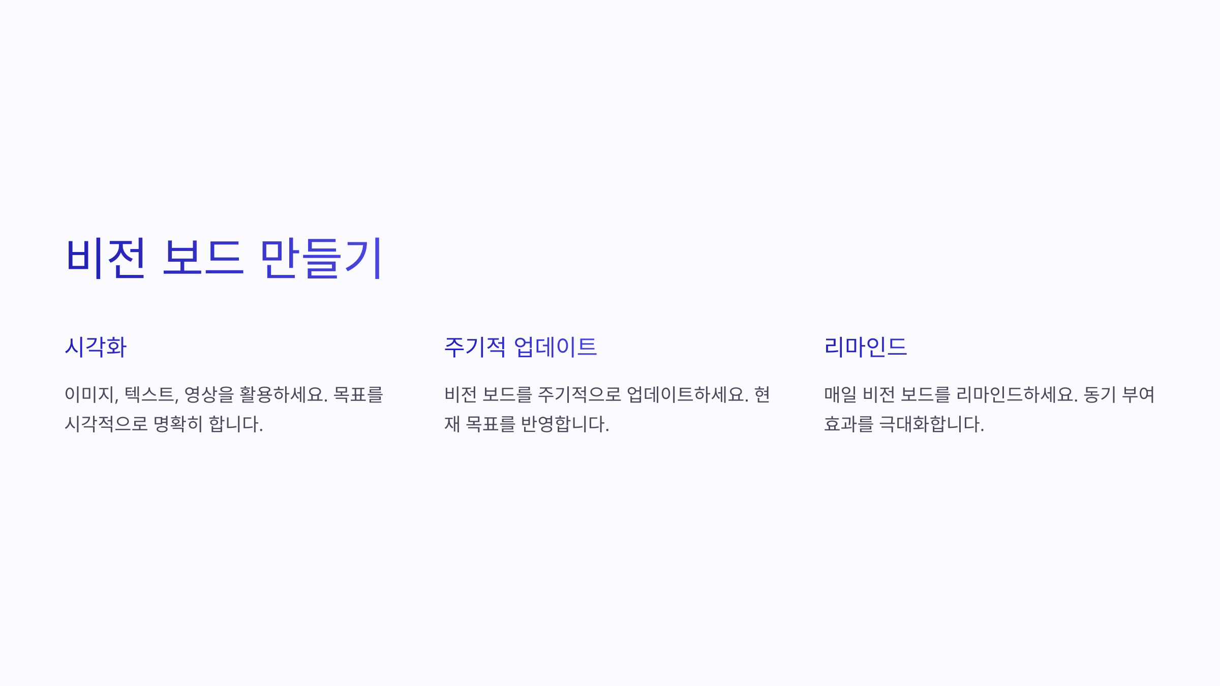 2025년 목표를 시각적으로 표현하는 방법 중 최고는 바로 비전 보드예요! 비전 보드는 내가 이루고 싶은 꿈이나 목표를 이미지, 글귀, 사진 등으로 꾸며서 한눈에 볼 수 있도록 만든 보드인데요, 매일 볼 수 있는 곳에 두면 자연스럽게 동기부여가 돼요.