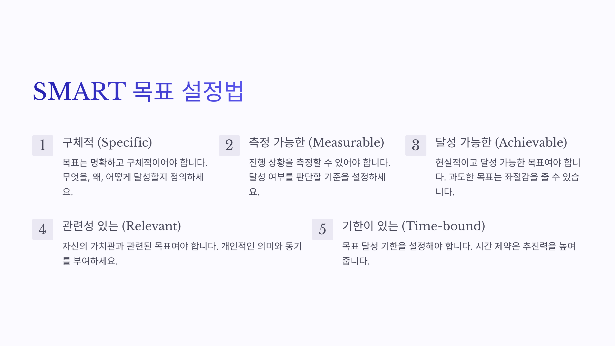 SMART란 Specific(구체적), Measurable(측정 가능), Achievable(달성 가능), Relevant(적절성), Time-bound(기한 설정)의 앞글자를 따서 만든 말이에요. 이 다섯 가지 요소를 지키면서 목표를 만들면 훨씬 실행력이 높아져요.