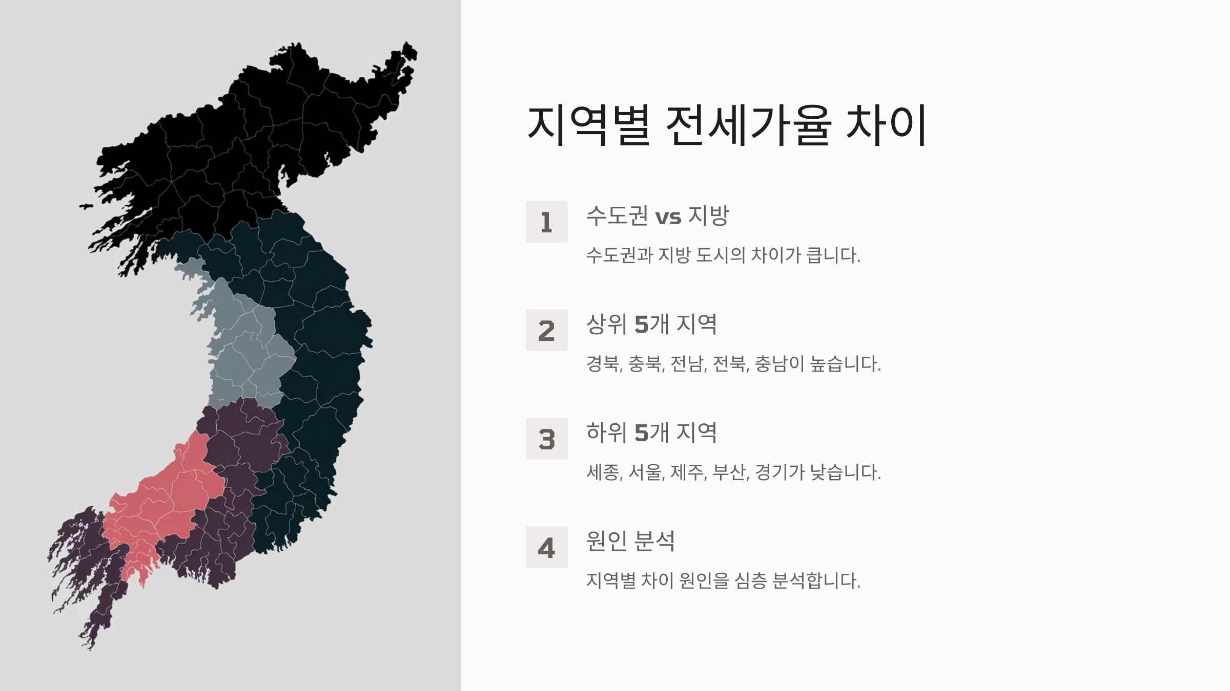 이처럼 지역별 전세가율 차이는 투자 전략을 짜는 데 아주 중요한 기준이 돼요. 서울 강남에 투자할지, 지방 소형 아파트에 투자할지 고민할 때 반드시 참고해야 하는 데이터죠! 🏡