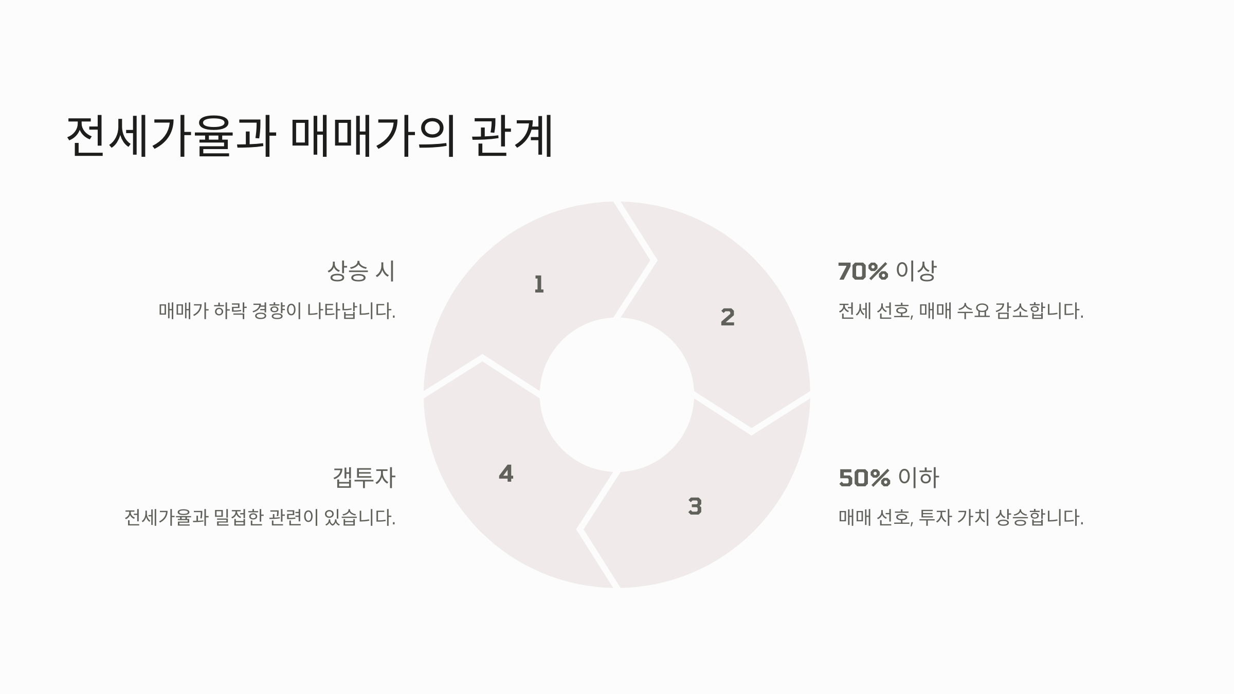 예를 들어 전세가격이 빠르게 오르면, 전세에 살기보다 차라리 매매로 전환하는 수요가 증가해요. 이때 매매 수요가 늘어나면서 집값이 오르기도 하죠. 반대로 전세가 낮아지면 굳이 집을 사지 않고 전세로 눌러앉으려는 경향이 강해져요.