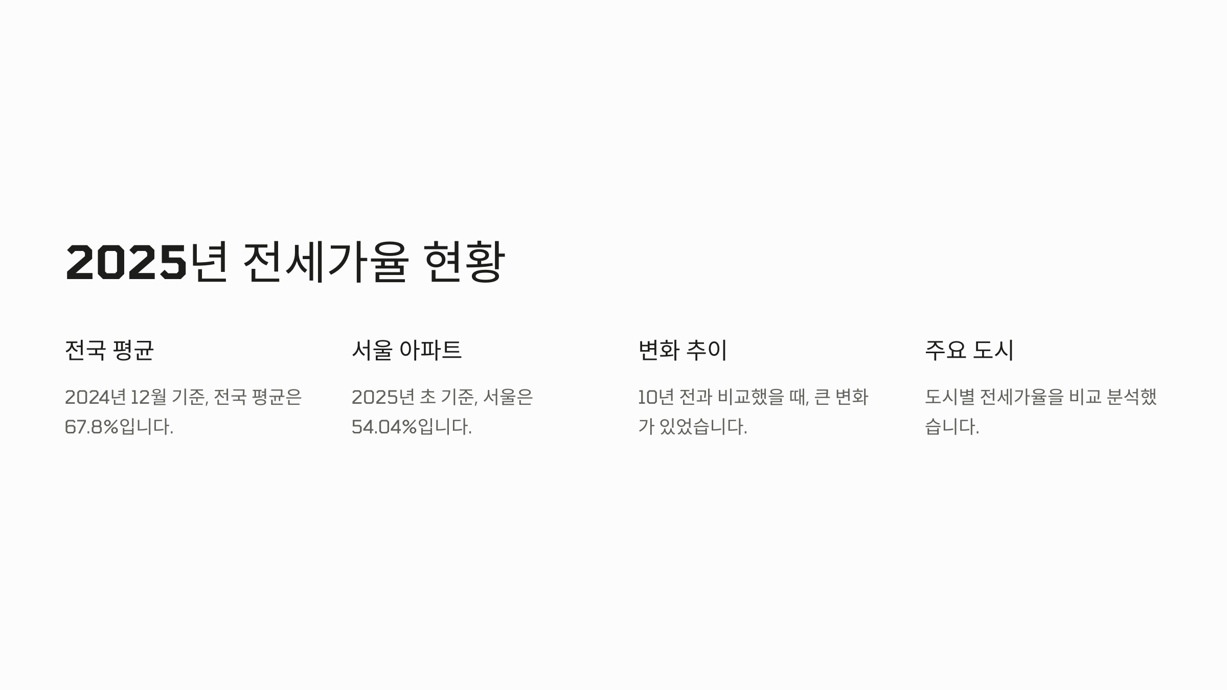 2025년 이후 전세가율은 당분간 낮은 수준을 유지할 가능성이 높아요. 금리가 안정되더라도 매매가가 빠르게 오르기 어렵고, 전세 수요도 예전만큼 많지 않기 때문이에요. 특히 공급이 늘어나면서 전세 물량이 많아진 것도 이유 중 하나예요.