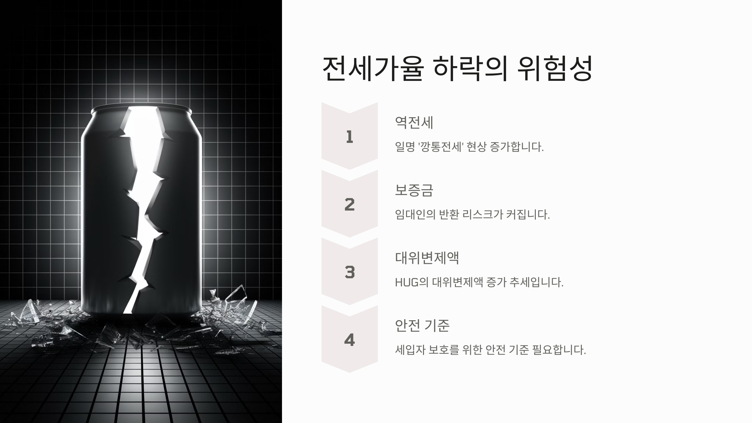 이렇게 전세가율 하락은 부동산 시장 전체에 악영향을 줄 수 있어요. 전세 보증금을 돌려주지 못하는 전세사기, 역전세난 같은 사회적 문제로 이어질 수 있거든요. 🏚️