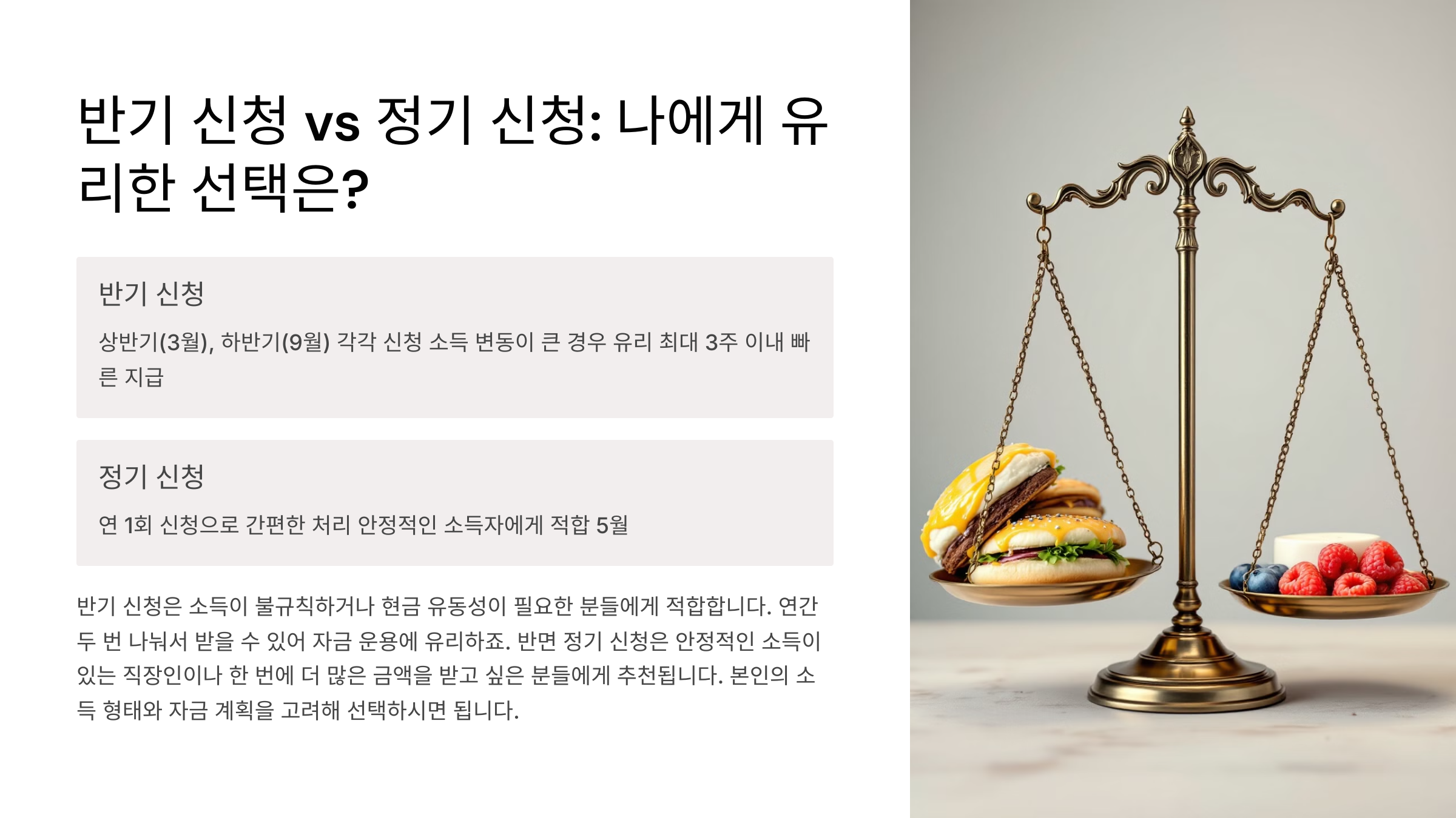 본인 상황에 맞게 정기 신청과 반기 신청 중 유리한 방식을 선택하면 돼요. 예를 들어, 매년 일정한 소득이 있는 경우 정기 신청이 더 유리할 수 있고, 당장 생활비가 필요하다면 반기 신청을 고려할 수 있어요!