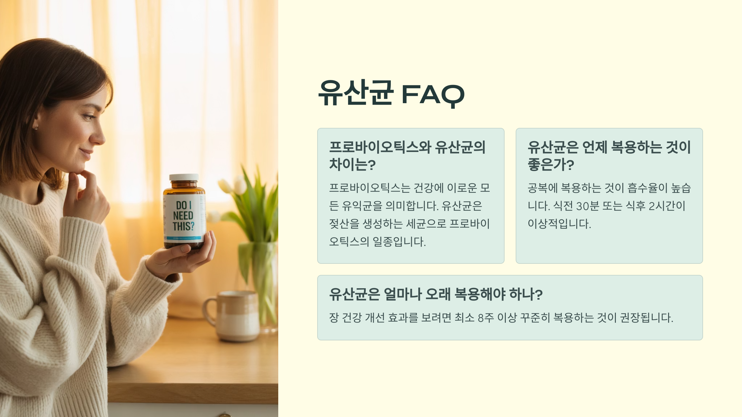 A8. 유산균은 몸속에서 정착하지 않기 때문에, 꾸준히 먹는 것이 좋아요. 멈추면 효과도 줄어요.