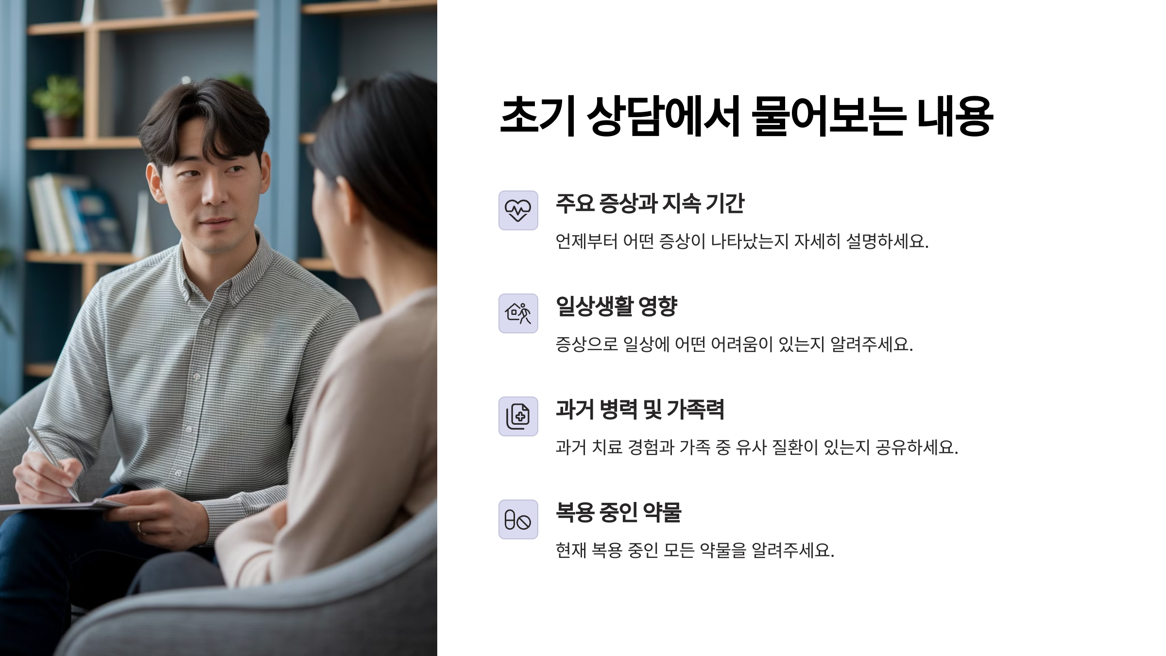 이런 질문들은 나를 평가하려는 게 아니라, 나에게 맞는 치료법을 찾기 위한 과정이에요. 당황하지 않아도 돼요!