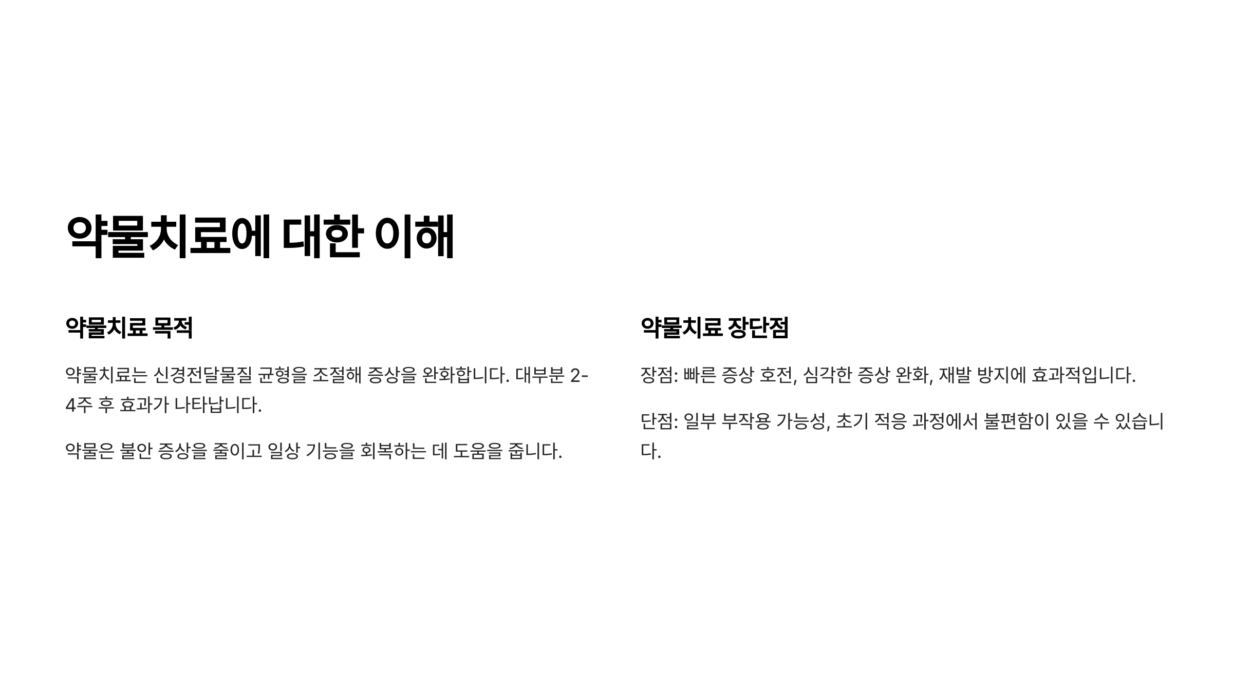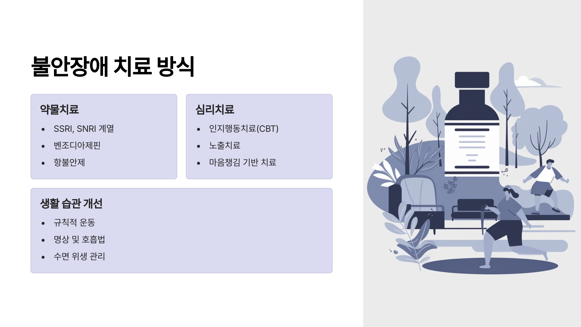 일반적으로 치료는 ‘약물치료’, ‘심리상담’, ‘생활습관 개선’ 세 가지를 병행하는 형태가 많아요. 상태가 가벼울 경우에는 상담만으로도 충분히 효과를 볼 수 있어요.