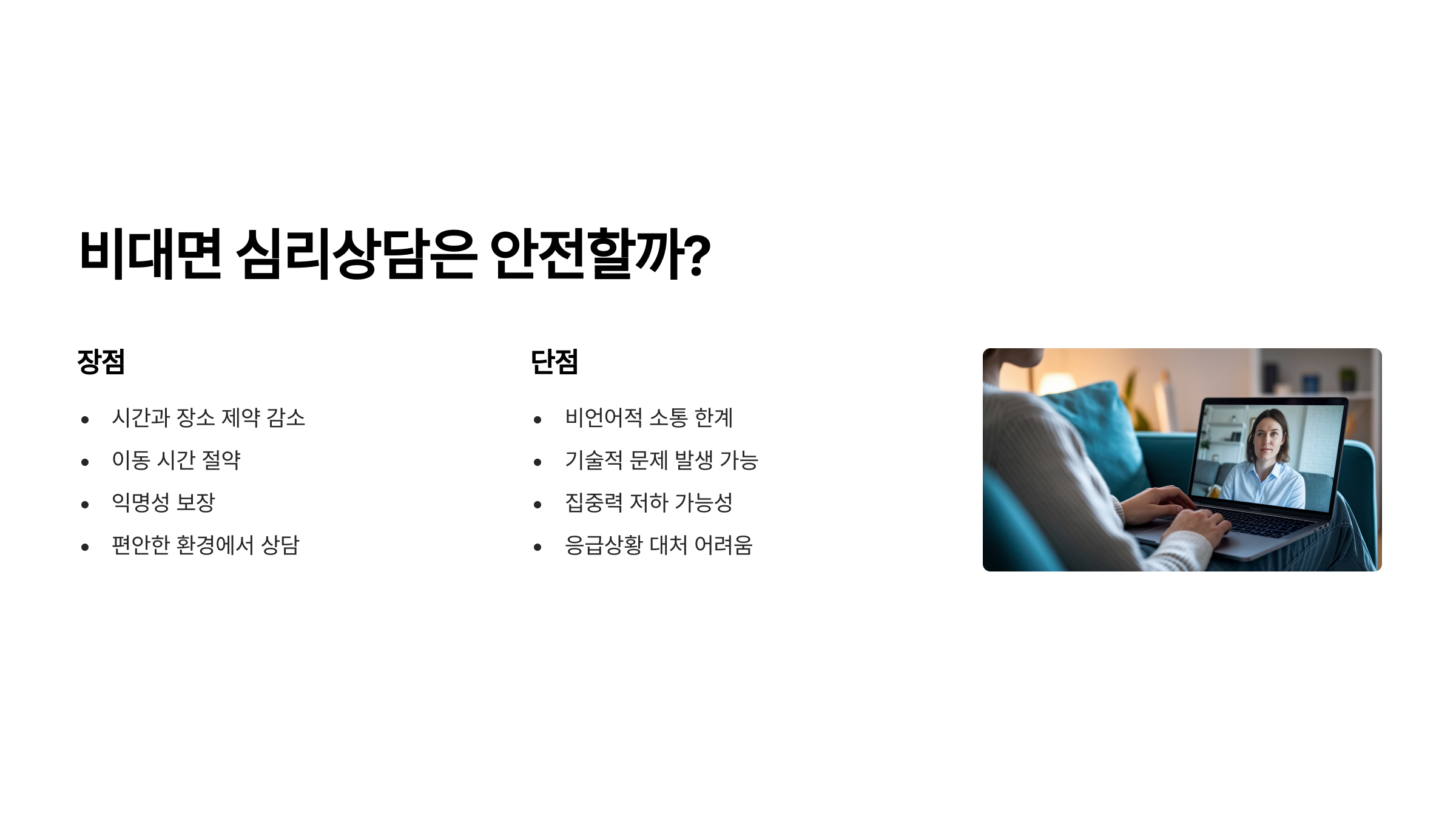 다만, 비대면 상담은 **의료행위로 인정받기 어려운 경우가 있어요**. 그 말은 실손보험 적용이 되지 않거나, 진단서 발급이 어렵다는 뜻이에요. 또한, 상담 효과도 대면 상담에 비해 제한적일 수 있어요.