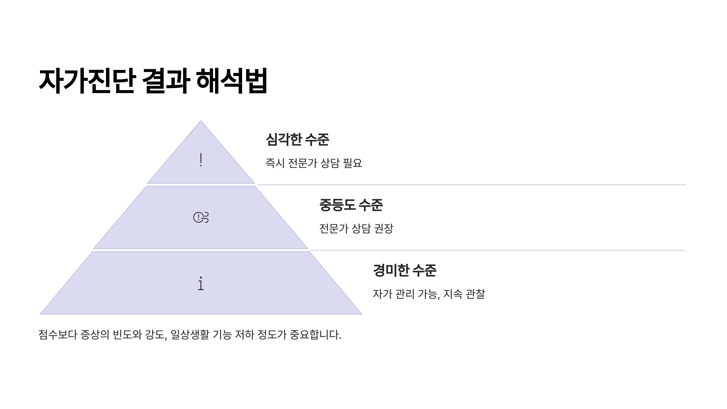 자가진단 후 아래 기준 중 하나라도 해당된다면, 꼭 상담이나 진료를 고려해보세요.