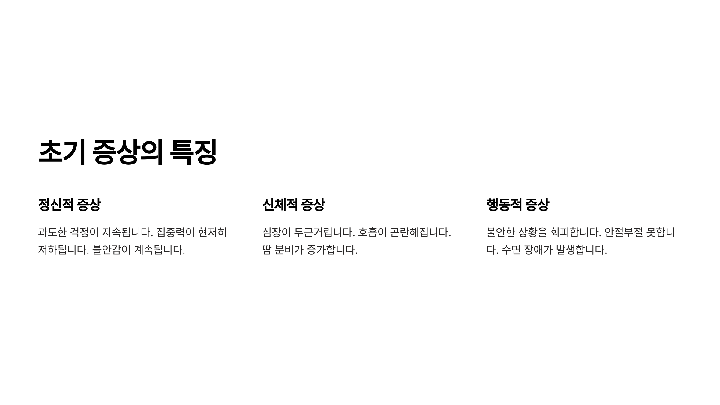 | 가슴 두근거림, 떨림, 숨 막힘 | 막연한 불안감, 예기불안, 감정 기복 |