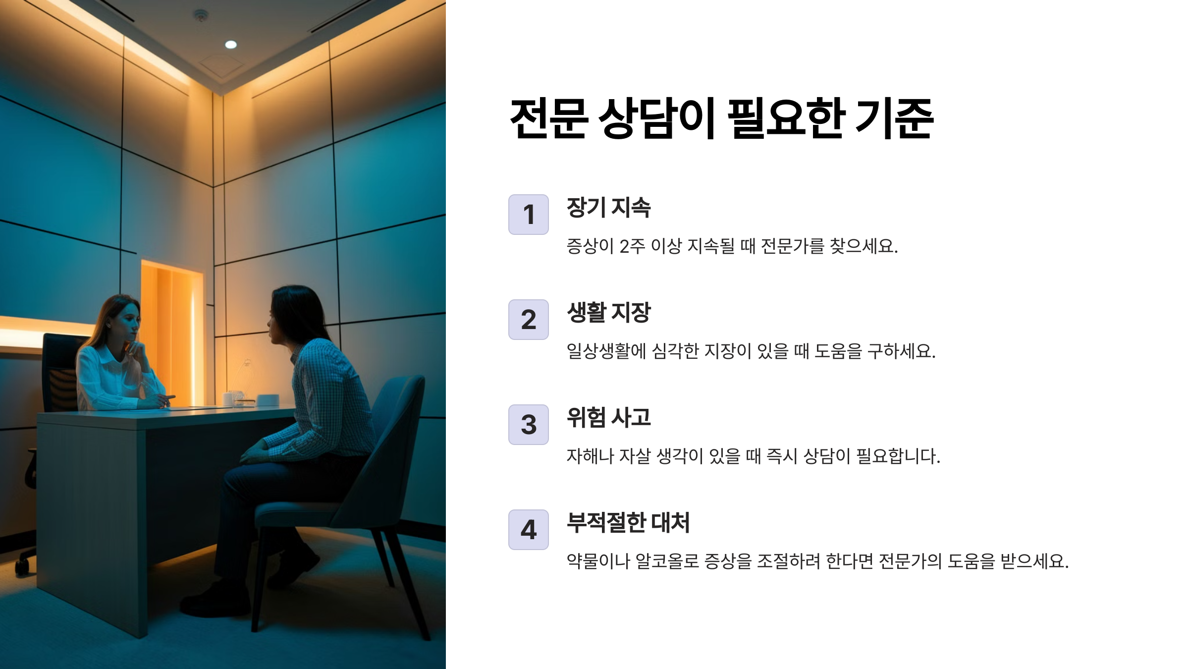 이런 경우는 더 이상 미루지 말고 전문가의 진단을 받아보는 게 나를 위한 선택이에요. 요즘은 비대면 심리상담도 있으니 부담 없이 시작해볼 수 있어요.