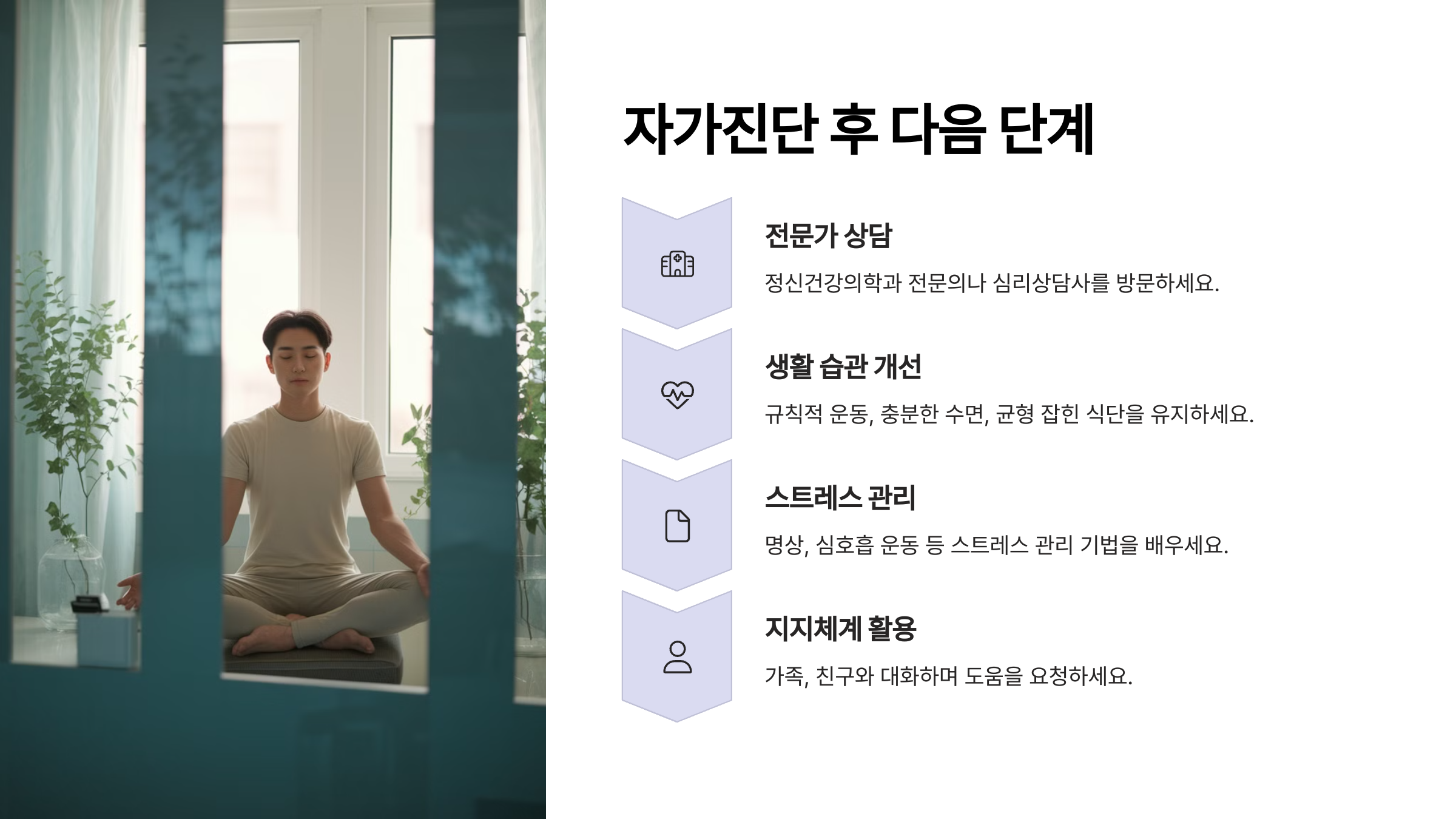 자가진단을 통해 불안의 징후를 파악했다면, 이제 다음 단계는 전문가의 도움을 받아보는 거예요. 병원 방문이 부담스럽다면, 우선 비대면 상담부터 시도해도 좋아요.
