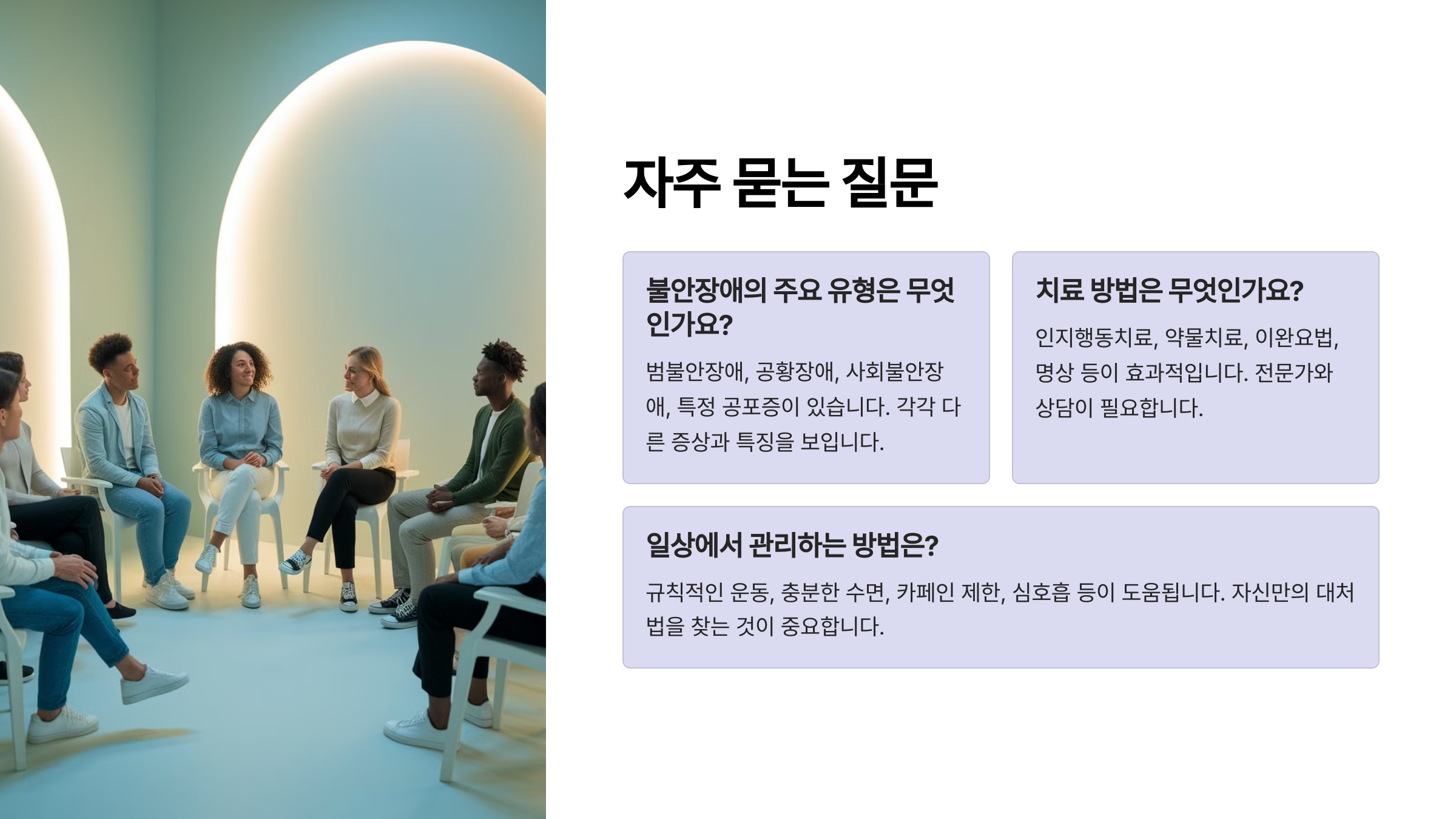 무엇보다 중요한 건 "불안장애는 의지로 극복하는 성격문제가 아니라는 것"이에요. 뇌의 신경전달물질과 스트레스 반응 체계가 관련되어 있는 질환이기 때문에, 전문가의 도움을 받는 것이 가장 확실한 방법이에요.