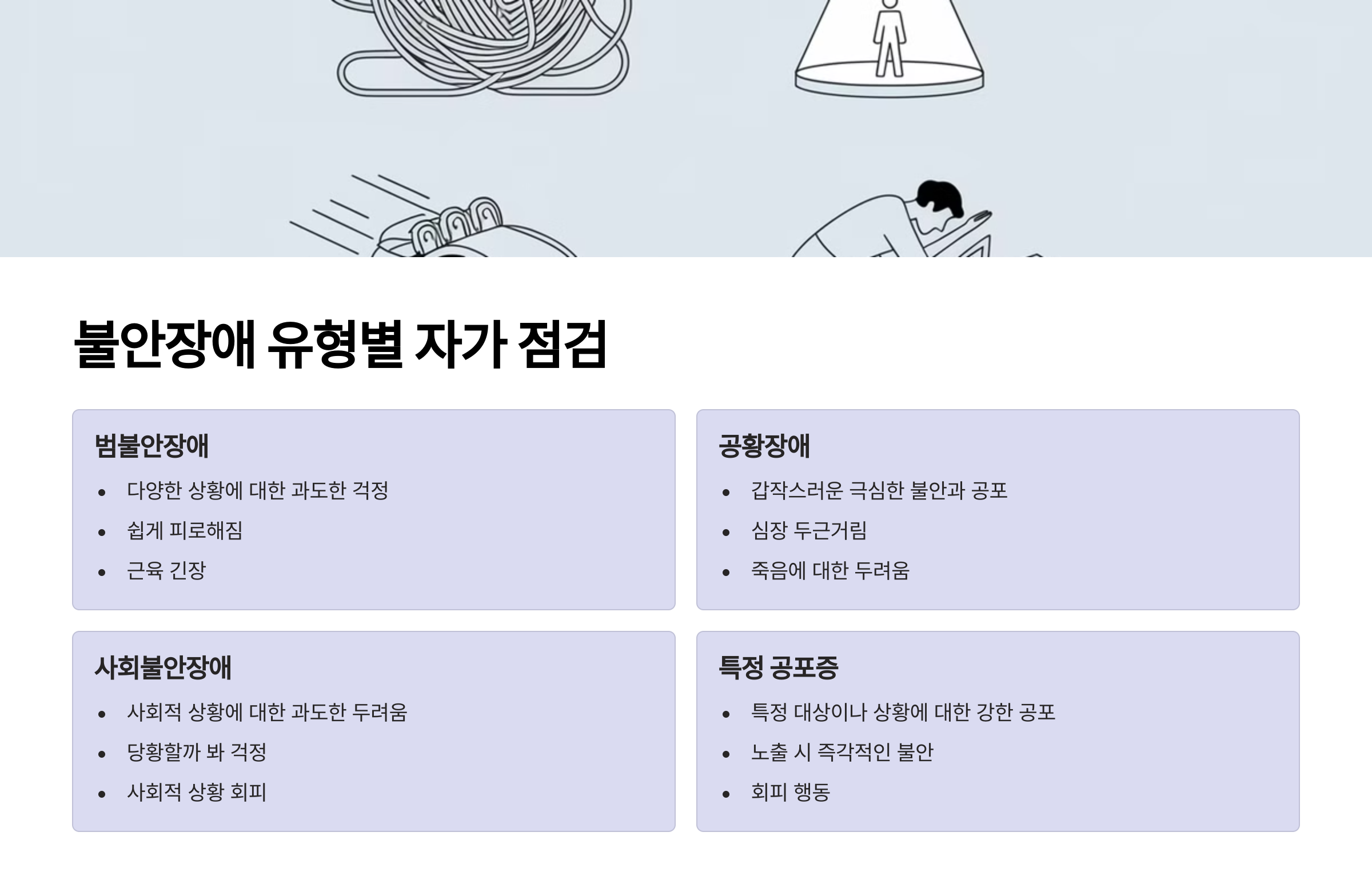 위 항목 중 2개 이상 해당된다면 해당 유형의 불안장애 가능성이 있어요. 정확한 진단은 전문가 상담을 통해 가능하니, 너무 혼자 고민하지 마세요!