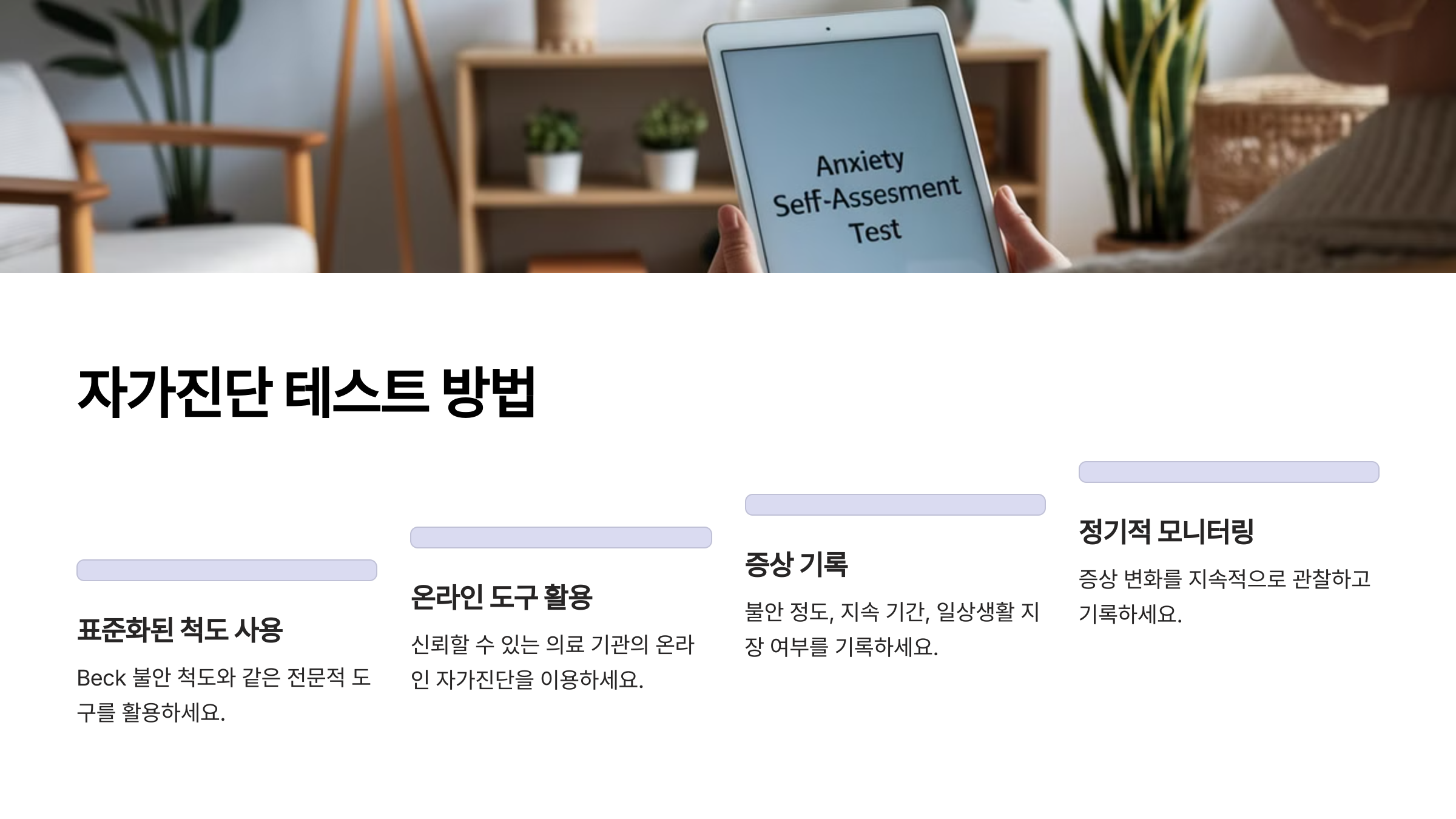 자가진단 테스트는 현재 느끼는 감정과 증상을 체크해서 간단하게 상태를 점검해볼 수 있어요. 전문적인 진단은 아니지만, 병원에 가기 전 나를 이해하는 데 도움돼요.