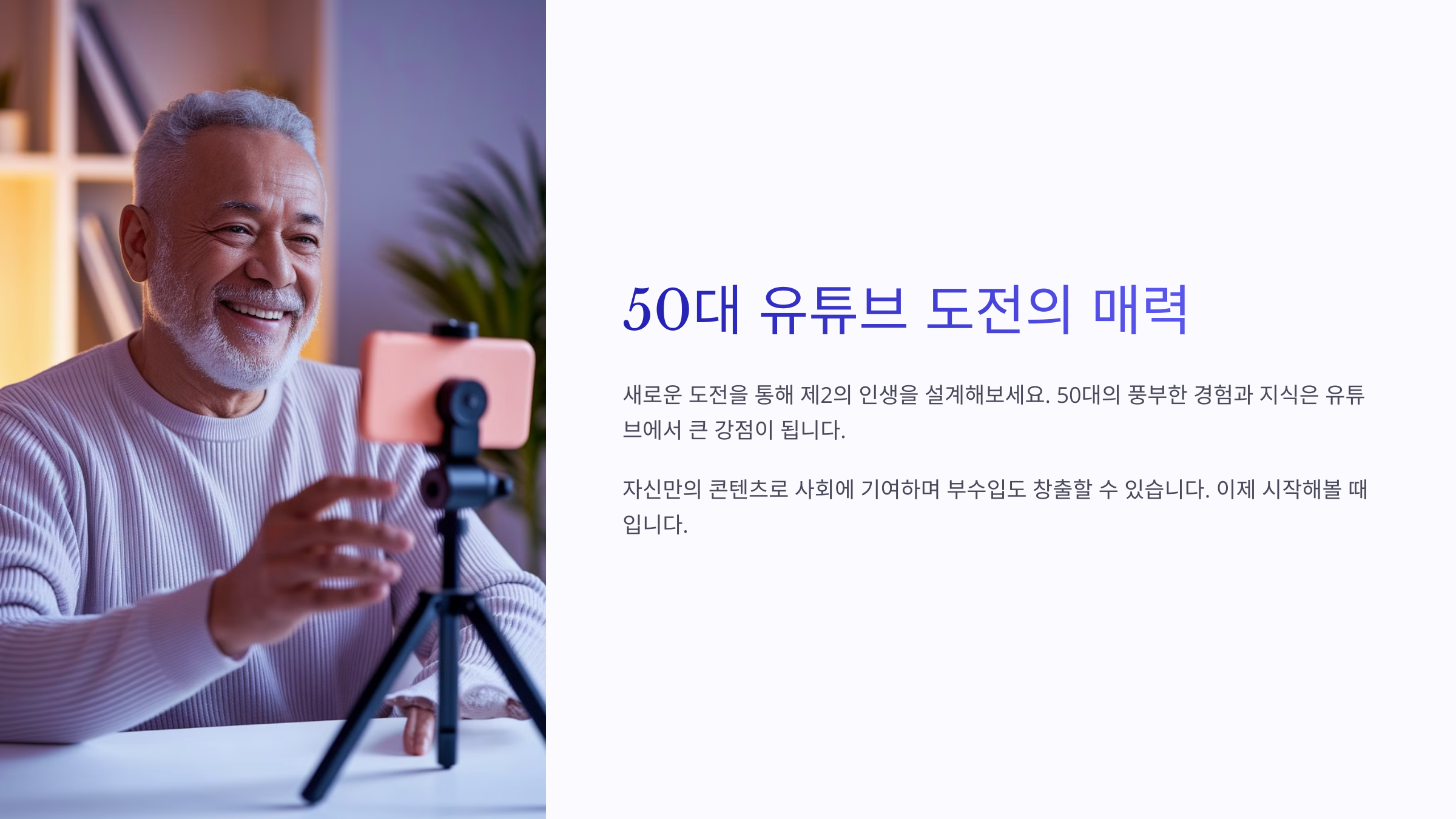50대는 결코 늦은 시작이 아니에요. 지금이 딱! 적기라고 말할 수 있어요. 영상 기술보다 더 중요한 건 진심과 지속성이니까요 😊