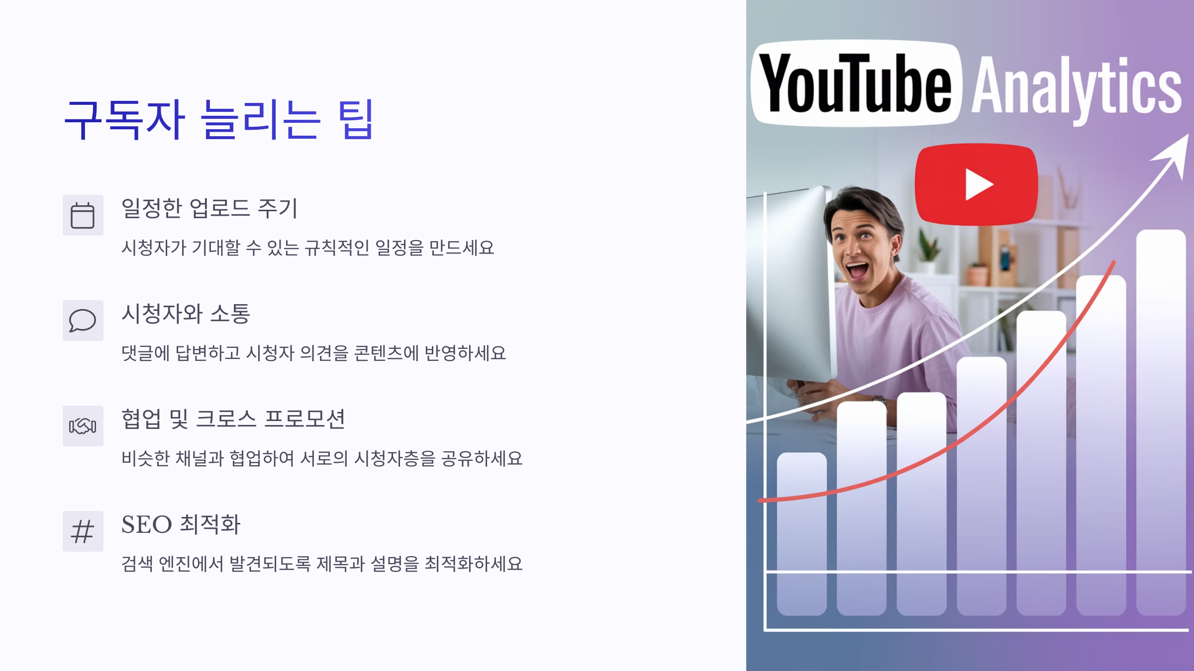 초기엔 지인들에게 알려보고, 블로그나 카페에 영상 공유하면 유입에도 도움이 돼요! 꾸준함과 소통, 이 두 가지가 구독자를 불러오는 마법이에요 ✨
