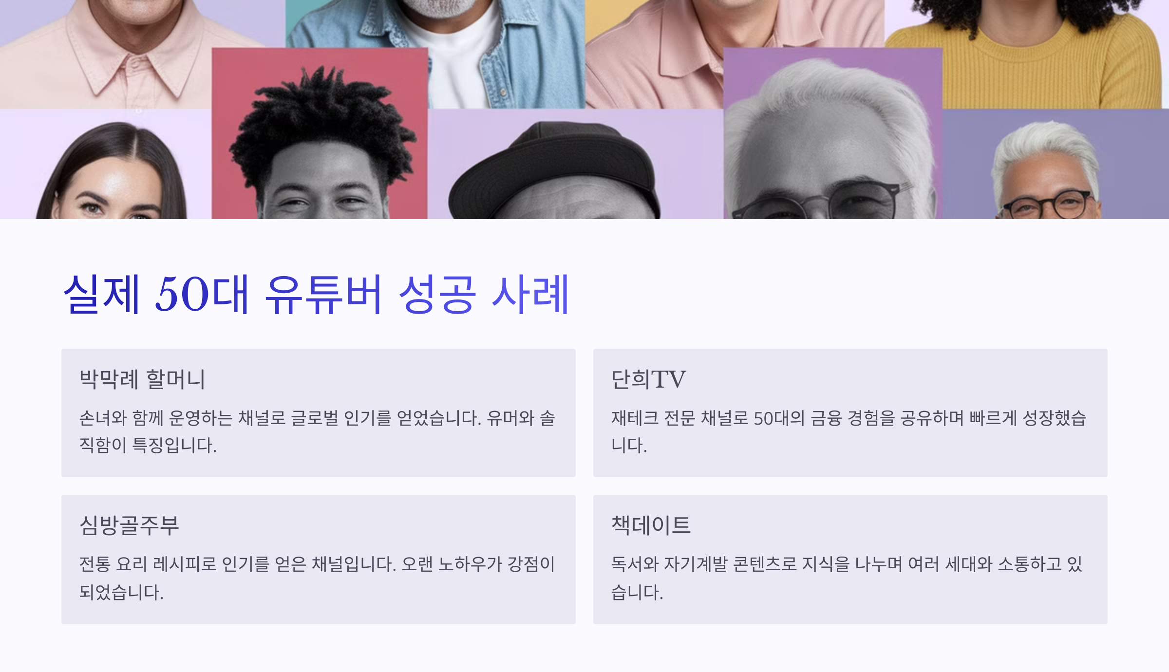 실제로 50대 유튜버 중에는 퇴직 후 요리, 건강, 여행, 손주 돌보기, 정리수납, 시골살이 등 다양한 주제로 조회 수를 쓸어 담는 분들이 많아요. 구독자도 같은 세대라 공감력이 정말 좋아요.