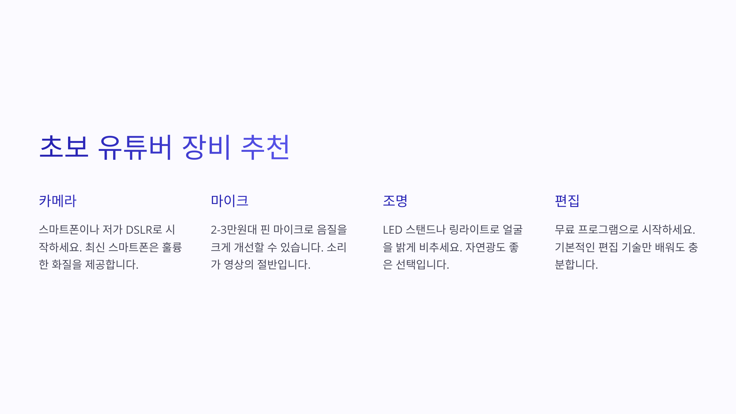 중요한 건 영상 품질보다 ‘내용’이에요. 하지만 좀 더 퀄리티를 높이고 싶다면 저렴하면서도 괜찮은 장비 몇 가지만 추천드릴게요.